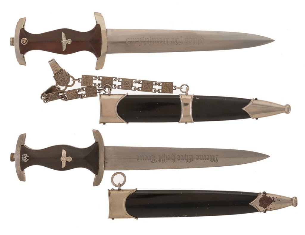 1) Hartkopf & Co. NSKK dagger with chained sheath, 13 1/2" OAL, 8 5/8" blade, "Nm" marked guard, wood grip and black enamel sheath with chain hanger. Blade cleaned, otherwise good. 2) Klass SS dagger, 13 3/8" OAL, 8 1/2" blade with RZM/1939 markings, silver fittings, and black enamel sheath. The grip shows some absent/reglued chips, otherwise good.