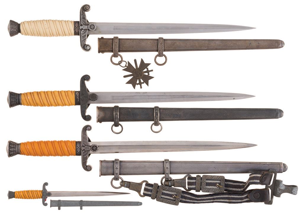 1) Nazi Heer dagger with sheath and belt hanger. The blade is marked "CARL JULIUS KREBS/SOLINGEN". Very good. 1) Nazi Heer dagger with sheath and medal. Blade marked "ALCOSA/SOLINGEN". The sheath has had a War Merit Cross with Swords attached to the upper suspension ring. Fine. 1) Nazi Heer dagger with sheath and unmarked blade. Fine. 1) Mini Nazi dagger/letter opener with sheath. Very good.