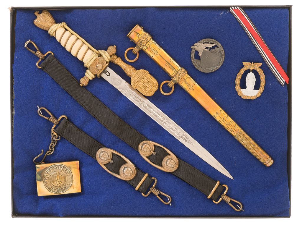 1) Paul Weyersberg Kriegsmarine dagger, 15 1/4" OAL, 10" etched double fuller blade, brass fittings, celluloid grip and a golden portepee. With a brass sheath and a pair of black ribbon suspenders with lion-faced buckles. In a Riker case with a "GOT MIT UNS" square brass buckle, an Otto Placzek-marked Blockade Runner badge and a "R.S.S." marked Anti-Submarine badge. Good overall.