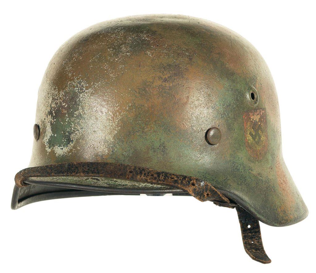 The shell has an applied tan, green, and white camouflage paint scheme with the party emblem decal on the left and the SS runes on the right. Includes the leather inner liner and chin strap. Fair with oxidation, paint loss, and edge wear. The leather liner is solid with small age cracks throughout.