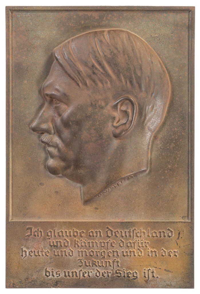 Heavy cast iron plaque with the left side profile of Adolf Hitler. The artists signature "W. WOLFF 33" is found at the base of the neck. The text reads "Ich glaube an Deutschland und kämpfe dafür heute und morgen und in der Zukunft bis unser der Sieg ist" and translates as "I believe in Germany and fight for her today and tomorrow and in the future until victory is ours". Fine with what appears to be remnants of bronze plating, scratches and areas of red/brown patina throughout.
