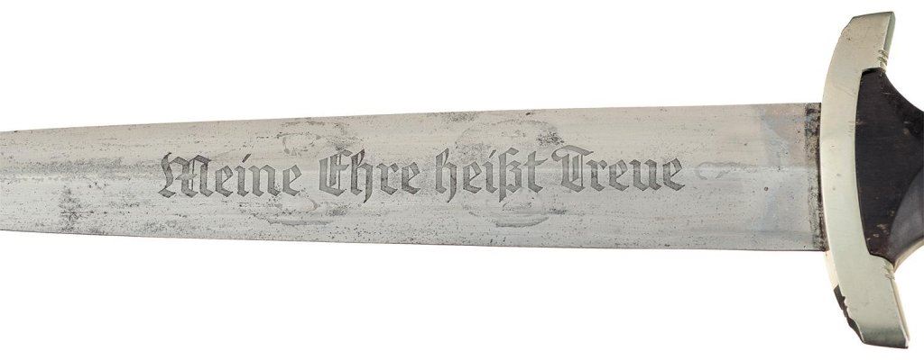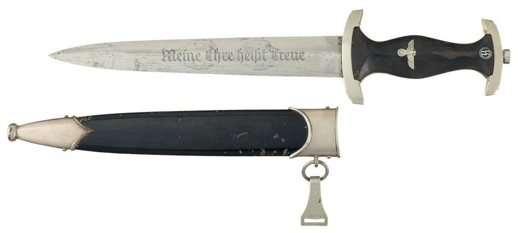 Measuring 13 3/4 inches overall with an 8 3/4 inch blade, etched with the standard SS motto on the obverse and the SS runes, "120/34" and "RZ/M" on the reverse. Nickel finished hardware, with "I" on the cross guard and a smooth wood grip with eagle and "SS" medallions. With a black enamel finished sheath and a partial belt hanger. Good, the blade shows some patches of shallow pitting and erosion, with good detail in the etching and mild handling marks. The grip is cracked along the back and near the pommel, with some scuffing in front. The sheath is good, with the tip dented in and some flaking and wear on the finish.