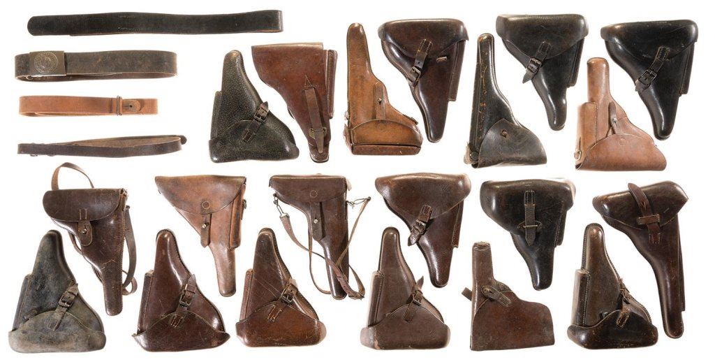 The lot consists of 24 leather holsters, mostly for Luger type pistols. Some of the pistols have various Nazi acceptance and makers' marks. Two leather belts, one with a "GOTT MIT UNS" belt buckle are also included as well as two sets of unidentified leather straps. Fair to fine.