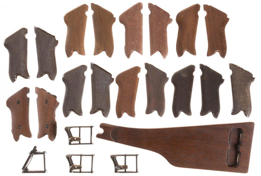 The lot consists of 1 flat board type Luger stock, four blue Luger board stock attaching irons, and a total of 17 Luger grip panels in both walnut and bakelite plastic. The grips includes a complete set of smooth Ideal grips with the attached screwplates for the very rare Ideal holster stock (holster stock not included). Items range from fine to very good. The Ideal grips are very fine.