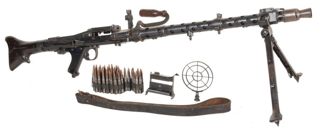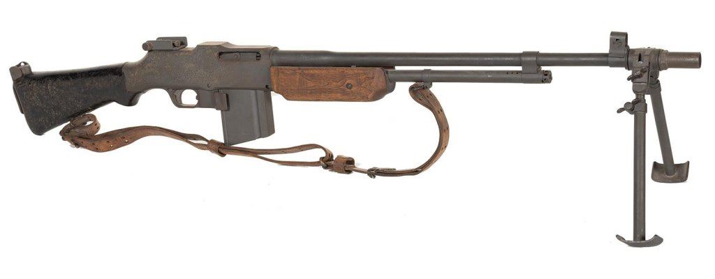 1) Browning BAR Replica. Non-firing replica fitted with a bipod. Good overall with general handling marks and some light scuffs. 2) MG-34 Replica Gun with Accessories. Non-functioning display piece features an attached bipod, carry handle, and folding front sight. Includes an ammo belt with dummy cartridges, sling, feed part, and anti-aircraft stand. Fair with areas of oxidation, handling marks, and assorted dings. Accessories are fair to fine.