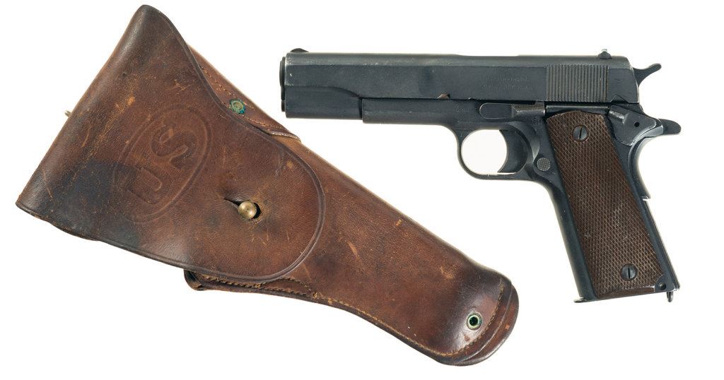 Manufactured in 1945. Includes a Rock Island Arsenal marked leather holster.