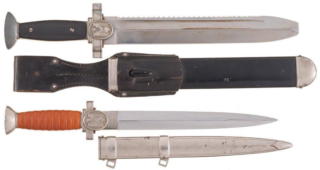 1) Nazi Red Cross enlisted man's hewer with sheath and frog. The blade is unmarked, and the frog is marked "CARL BUSSE/MAINZ/1940". Very good overall. 2) Nazi Red Cross leader's dagger with sheath. Very good.