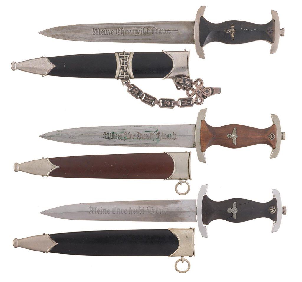 1) SS dagger with sheath and hanger. The reverse side of the blade is marked "RZM/1053/39/SS". Good with some slight gaps at the fittings and handling marks. 2) SS dagger with sheath. Fair with handling marks, broken grip, replacement guard and pommel, and gaps in fitting. 3) SA dagger with sheath. Good with handling marks, tool marks on the pommel nut, and scratches on the sheath.