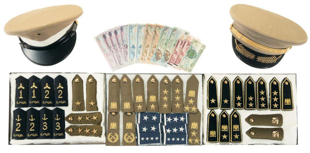 1) Three framed displays of military shoulder boards, mostly Iraqi. Includes both army and navy rank insignia as well as several unidentified pieces. Excellent. 2) Two military uniform caps. Both caps have tan bodies and black patent leather visors. One has a tan central band with a gold strap and embroidered gold leaves with a collection label on the inside noting it is a summer fabric cap for a Major, Lieutenant, or Colonel. Both are excellent. 3) 14 Iraqi currency notes. Excellent.