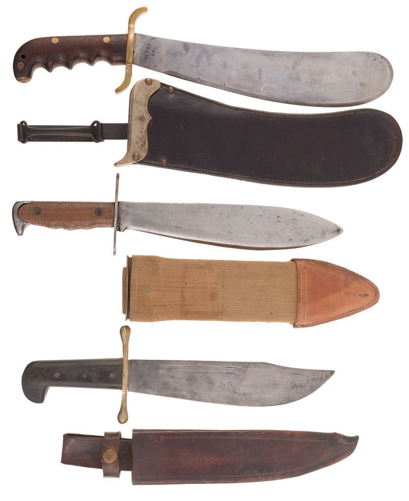 1) U.S. marked Model 1904 Hospital Corps bolo knife with leather scabbard and belt hanger. 17 1/4" OAL, 12" single edge blade. Blade is marked "US/18238" on one side and "SA/flaming bomb/1911" on the other. Scabbard is marked "ROCK ISLAND/ARSENAL/1911/H.E.K." Condition: Very good. 2) U.S. marked Model 1917 C.T. Bolo knife with canvas and leather scabbard. 14 7/8" OAL, 10 1/4" single edge blade. Blade is marked "CHAS A ROTH JR./1918" and "PLUMB/ST. LOUIS/1918" while the reverse side is marked "U.S./1917 C.T." Condition: Fair to good. 3) Unmarked bowie knife with leather sheath. 14" OAL, 9 3/8" single edge double fuller blade. Condition: Fair to good.