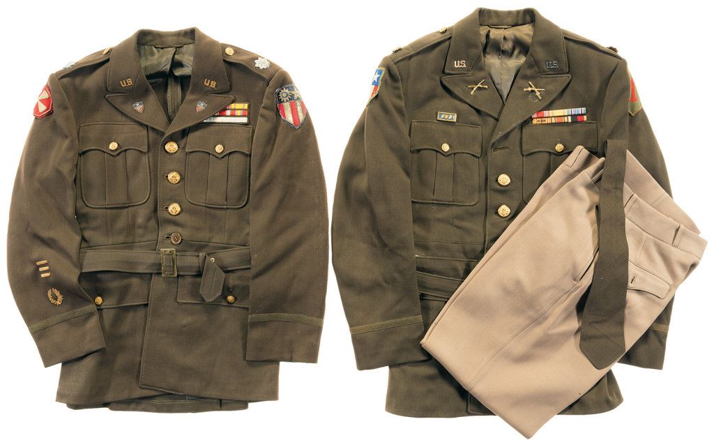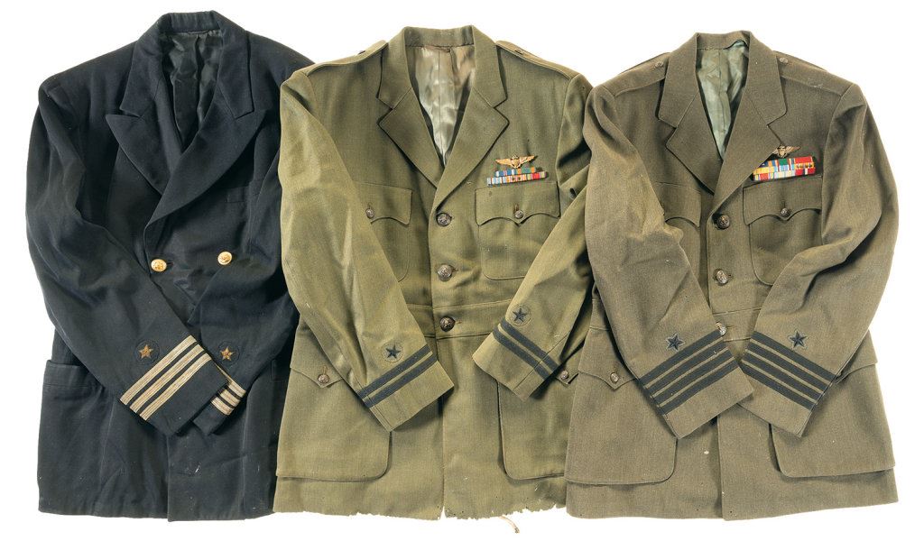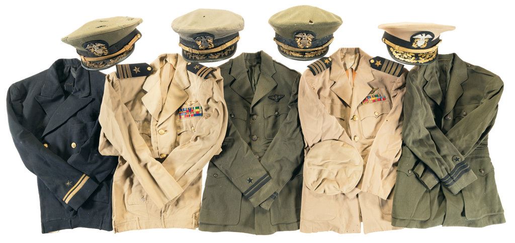 The lot includes: 4 U.S. Navy dress caps, 1 unmarked tan cap, 2 uniform sets including jackets and trousers, and 6 other uniform jackets displaying assorted ranks and badges. Poor to very good. Some items show moth damage throughout, general wear and some light staining. 2 green U.S. military officer's jackets with assorted pins and ribbons. The decorations and distinctive shoulder patches indicate these as having belonged to and officer in the First American Volunteer Group of the Chinese Air Force, also known as The Flying Tigers. A pair of slacks and a dress tie are also included. Fine overall with some light discoloration and storage wear.