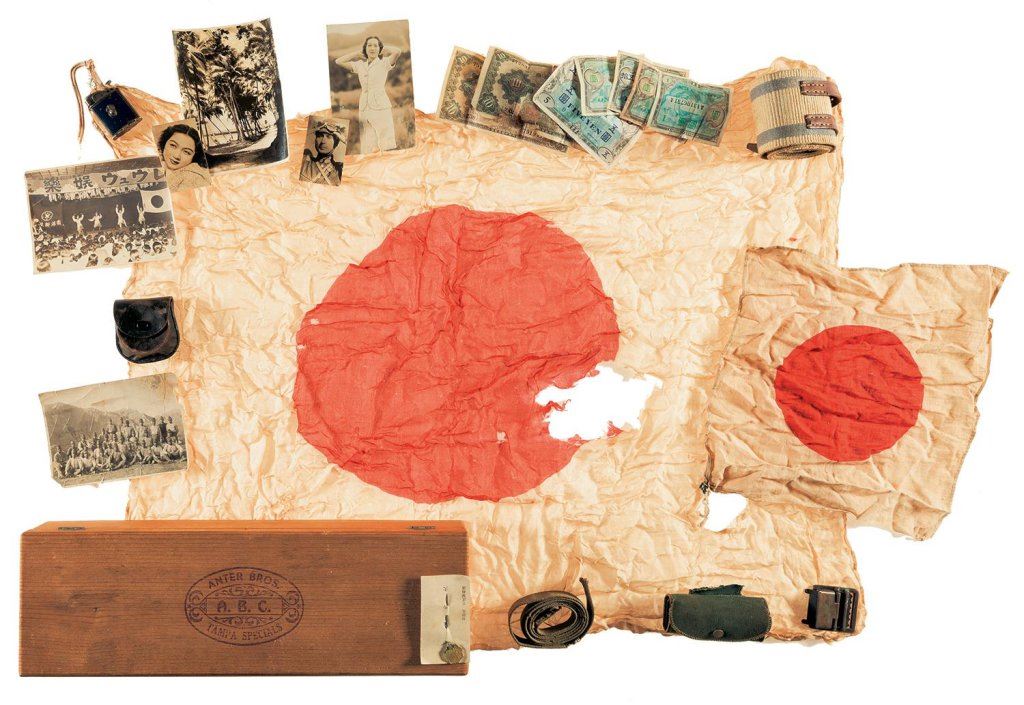 Dated 1886. With a box of assorted WWII/Pacific Theater bring-back style items, including two small Japanese flags, currency, and other small items.