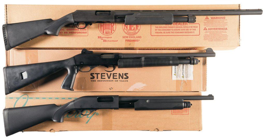 Three Slide Action Shotguns with Boxes -A) New England Firearms/Hawk Industries Pardner Pump Shotgun