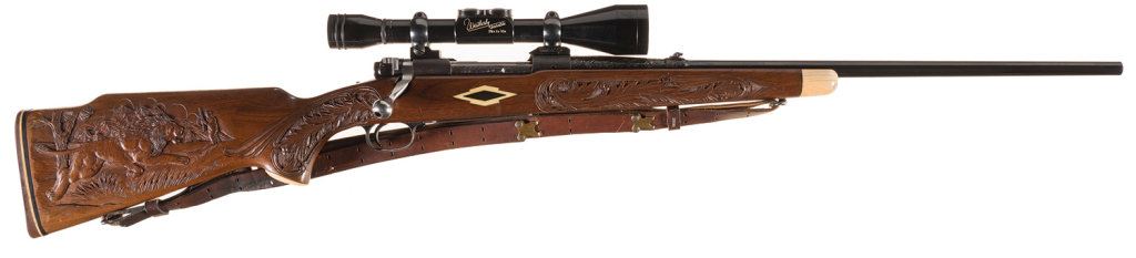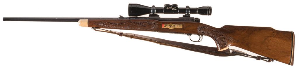 Engraved Pre-64 Winchester Model 70 Bolt Action Rifle with Scope and Carved Stock