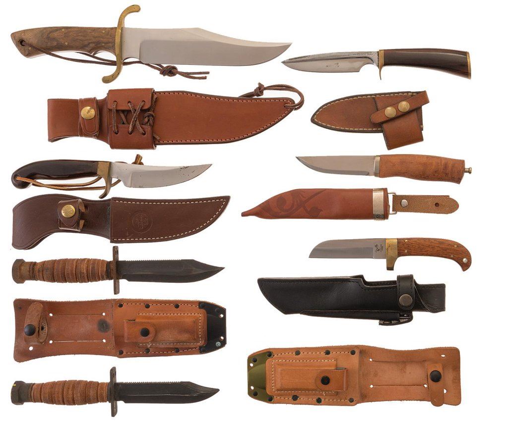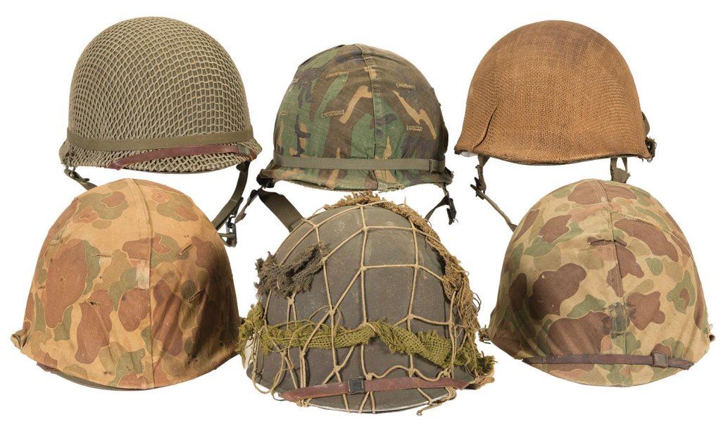 Three have camouflage fabric, two have mesh, and one has burlap and is marked for Marine Corporal J. E. Williams. Very good overall with some tears on the covers. Knives include two Camillus air-crew knives, a Boker bowie, and others, all with leather sheaths. The air-crew knives show rust; otherwise, the lot is in good to very good condition overall.