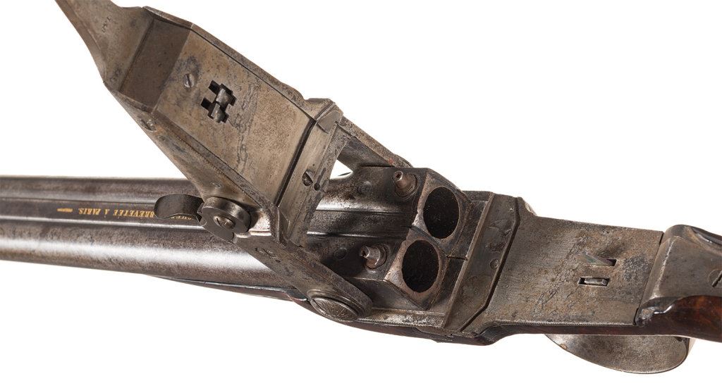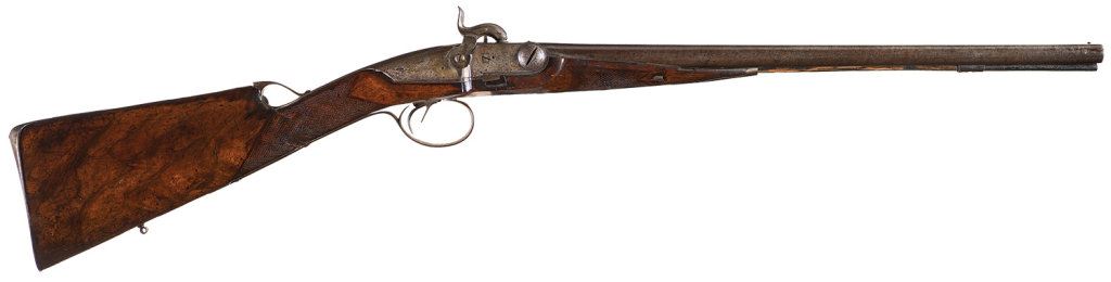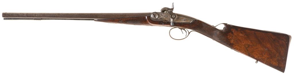 Lot 4763 Gold Inlaid Patented "Monkey Tail" Breech Loading Side by Side Percussion Shotgun