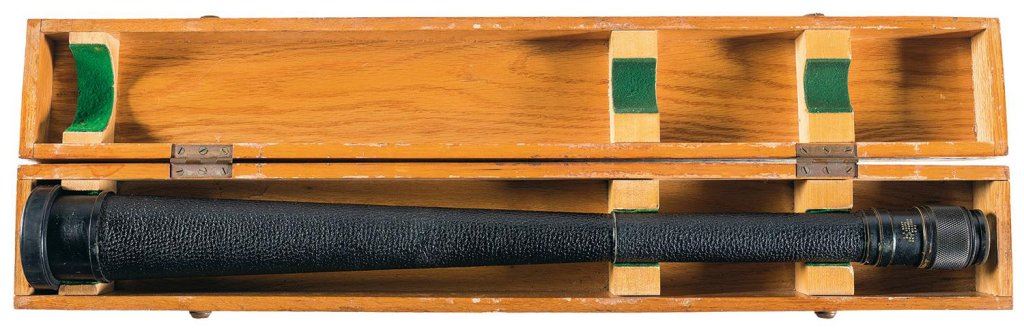 Measuring 31 inches overall, the spyglass is of alloy construction overall with black paint finish and a leather texture over much of the body. A hard rubber protective ring is installed around the objective lens, and the blackened brass eye bell is marked "U.S. NAVY/BU. SHIPS/ QM 16-POWER/MK. I NO.4599/1942". With the scope is a hardwood case with brass tag from the Kollmorgen Optical Corporation with Bureau of Ships markings. The spyglass is fine with some mild exterior wear, and the optics are clear. The case is very good as refinished with yellowed varnish on exterior, light scuffs and markings.
