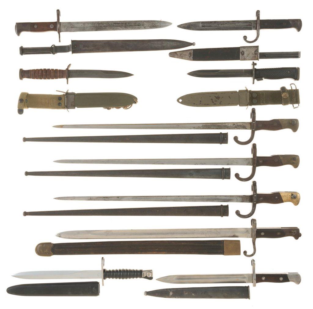 1) "U.S." and "1901" marked bayonet with scabbard. 2) Remington Arms Co. bayonet with scabbard. Handguard marked "REPUBLICA MEXICANA". 3) "U.S. M3-UTICA" marked knife with "USM8" marked scabbard. 4) "U.S. M5A1/MILPAR COL" marked scabbard with bayonet. 5) "MRE D'ARMES DE ST. ETIENNE MAI 1879" marked bayonet with scabbard. 6) "MRE D'ARMES DE ST. ETIENNE JUILLET 1876" marked bayonet with scabbard. 7) "MRE D'ARMES DE ST. ETIENNE GBE 1878" marked bayonet with scabbard. 8) Unmarked with leather covered scabbard. Handguard is marked "P 4063". 9) "F/W" marked bayonet with scabbard. Blade is also marked "W/489963". 10) "WEYERSBURG/KIRSCHBAUM & C/SOLINGEN" marked bayonet with scabbard. Condition: Most of the items are in fine condition and a few are very good.