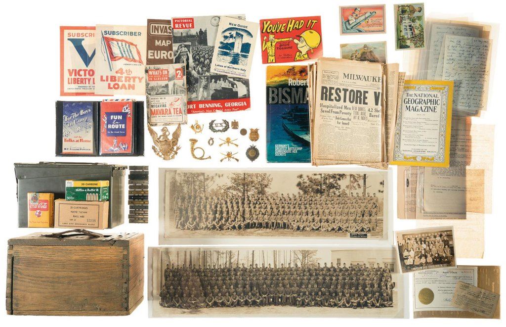 Grouping includes two panorama shots of U.S. Army units (undated but uniforms and racial integration suggest 1950s vintage), a handful of assorted stripper clips, a large gilt American Eagle helmet plate, assorted smaller badges/pins, Spanish-American/Philippine mementos, boxed Coca-Cola playing cards, assorted war-themed papers and correspondence from the Philippines through WWII, 2 ammunition containers (1 hinged wood box, one steel can), a box each of Seller & Beloit 30 M1 Carbine and Lake City Ordnance 7.62mm M80 Ball ammunition, a number of WWII/post-War newspapers and other periodicals, papers related to the 1945 awarding of the Bronze Star to a Sergeant in the 474th Infantry Regiment, and a copy of the book "Bismarck" by Robert Ballard. Fine overall.