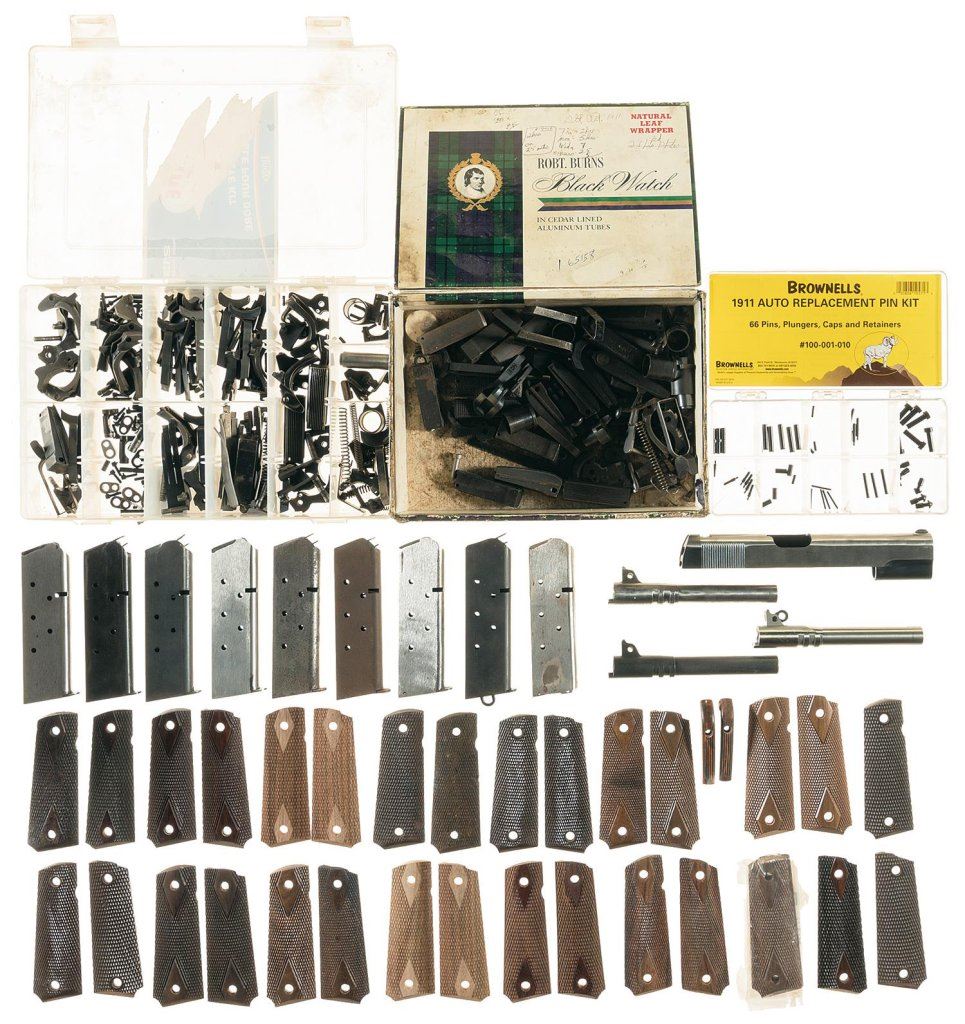 The lot consists of multiple sets of both plastic and walnut grips, three barrels, one slide, a Brownell's Model 1911 replacement pin set, assorted mainspring housings, pins, triggers, magazines, safeties, and other small parts. Collection is good overall.