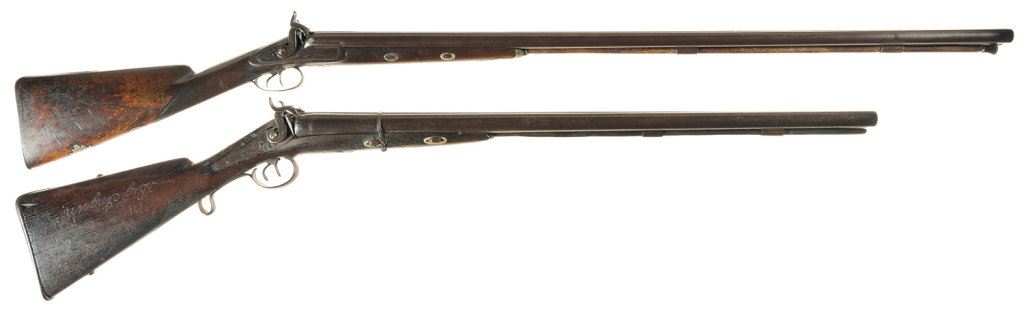 Two Engraved Double Barrel Percussion Shotguns -A) Perkins Shotgun with Silver Inlaid Hunting Scene