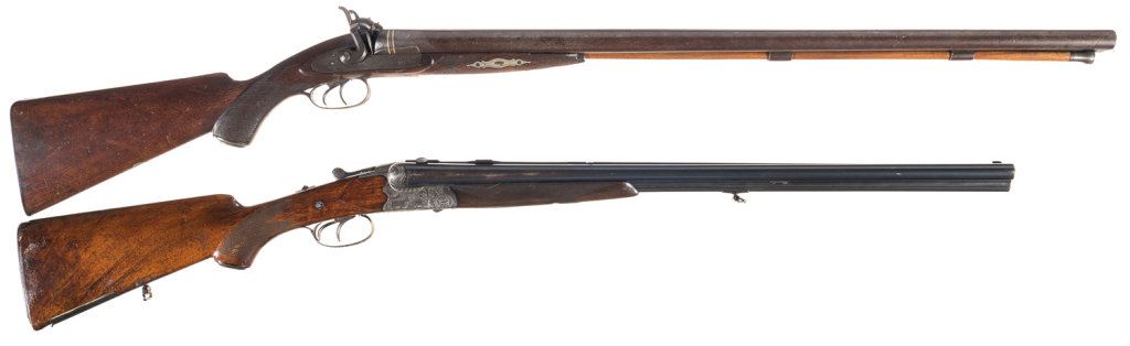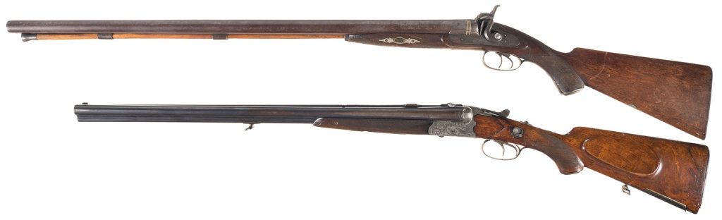 Lot 4773 Two Double Barrel Shotguns -A) Engraved Silver and Gold Inlaid W. Richards Percussion Shotgun