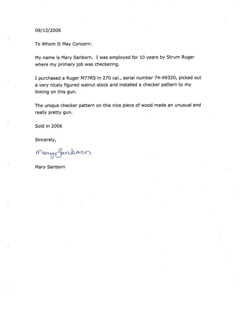 The receiver is fitted with scope rings. Includes a letter from the Ruger employee that checkered the stock.