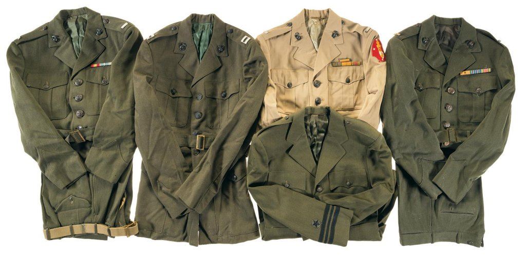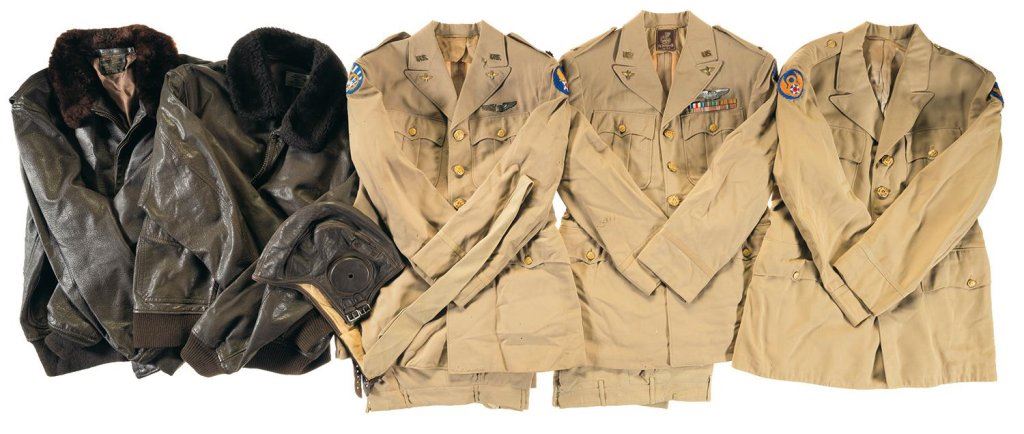 The lot consists of: 1) Tan dress jacket with a shoulder patch for the 5th Air Force. Very good with a few small scattered moth holes. 2) Tan dress jacket with a shoulder patch for the 8th Air Force. Very good with small scattered moth holes. 3) Tan dress jacket with no unit patch. Very good. 4) Leather pilots helmet. Very good. 5) Two bomber style jackets with military tags. Very good. 6) Five U.S.M.C. Jackets. One is khaki, and the others are green. One has no rank on the shoulders. One is for a captain, one is for a second lieutenant, and the others are for a first lieutenant. Most are very good but one has moderate moth damage. 7) Two pairs of pants.