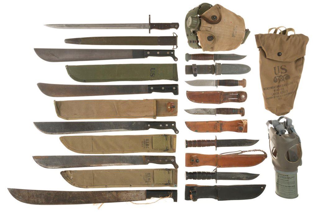 This lot contains: (1) gas mask with "US" marked canvas bag, (1) canteen with canvas cover and belt, (1) unmarked trench style fighting knife with sheath, (1) USN MK1 knife with sheath, (1) "USN" marked knife and sheath with "CHRISSY 1944" marking, (1) unmarked fighting knife with sheath, (1) "USN" marked Robeson "ShurEdge" No. 20 knife with sheath, (1) bayonet marked "1917/REMINGTON" on left side and "flaming bomb/US" on right side, (2) machetes marked "LEGITIMUS/COLLINS & CO./MADE IN U.S.A./NO. 37" with U.S.M.C. marked sheaths, (1) unmarked machete, (1) machete with sheath marked 'MADE IN SHEFFIELD/ENGLAND" on left side of blade, and (1) machete marked "U.S./ONTARIO KNIFE CO." with a US marked sheath. Condition: Fine overall with a few very good items and a coupe fair items. Most of the knives show signs of sharpening.
