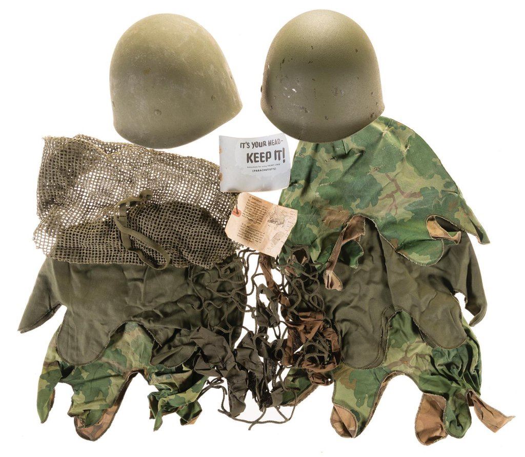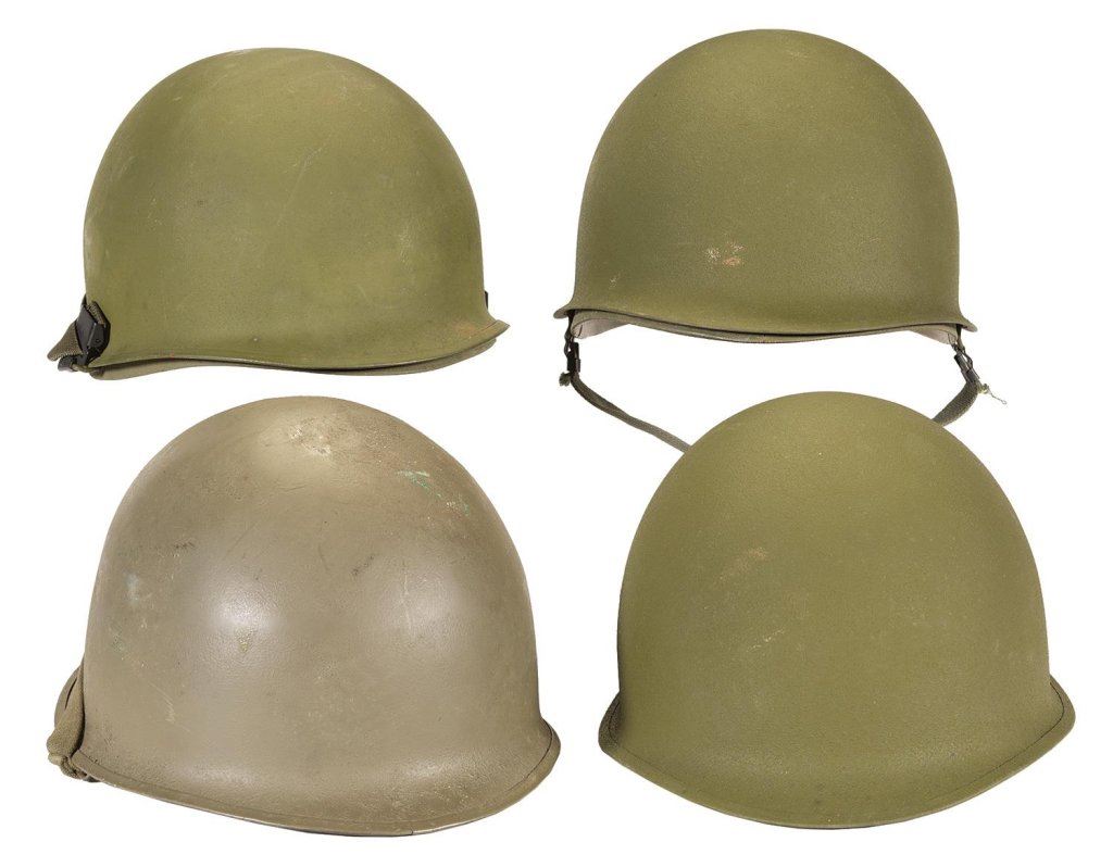 Four U.S. M1 Helmets, Including an Early Fixed Bale Model, with Extra Liners, Covers, and Related Accessories
