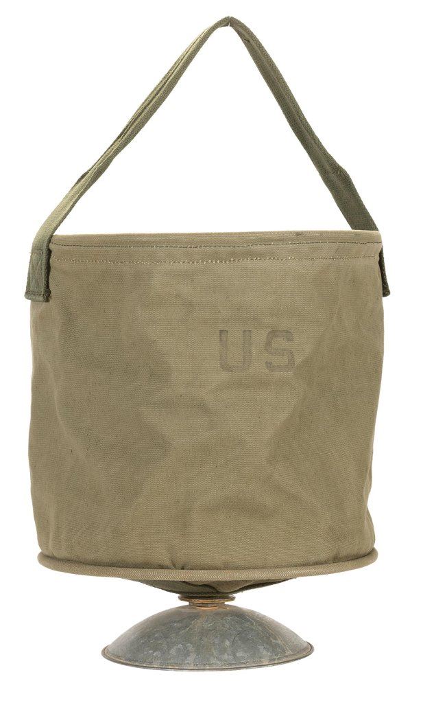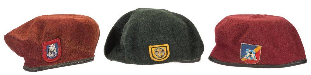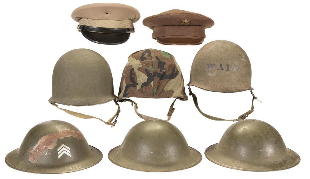 1) Scarce canvas bucket shower. 2) Maroon beret with 82nd Aviation Regiment style insignia. 3) Maroon beret with 505th Parachute Infantry Regiment style insignia. 4) Green beret with U.S. Special Forces style insignia. 5) Two military dress caps. 4) One camouflage canvas covered helmet. 5) One "WAFD" marked helmet. 6) One helmet with "AUBREY E. STIBGEN/36262391" marked on inside. 7) Three brodie style military helmets. Items are fine to excellent.