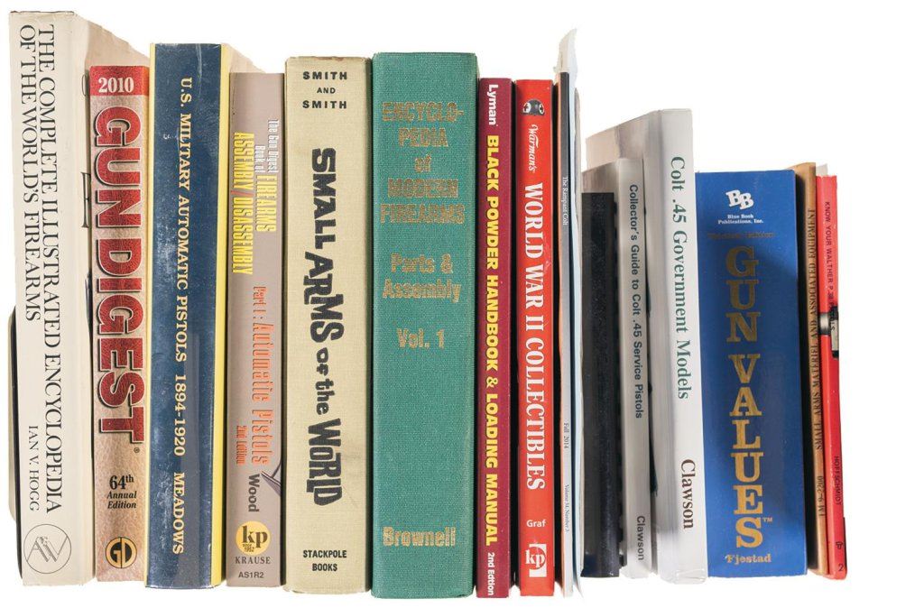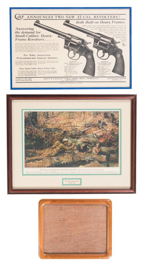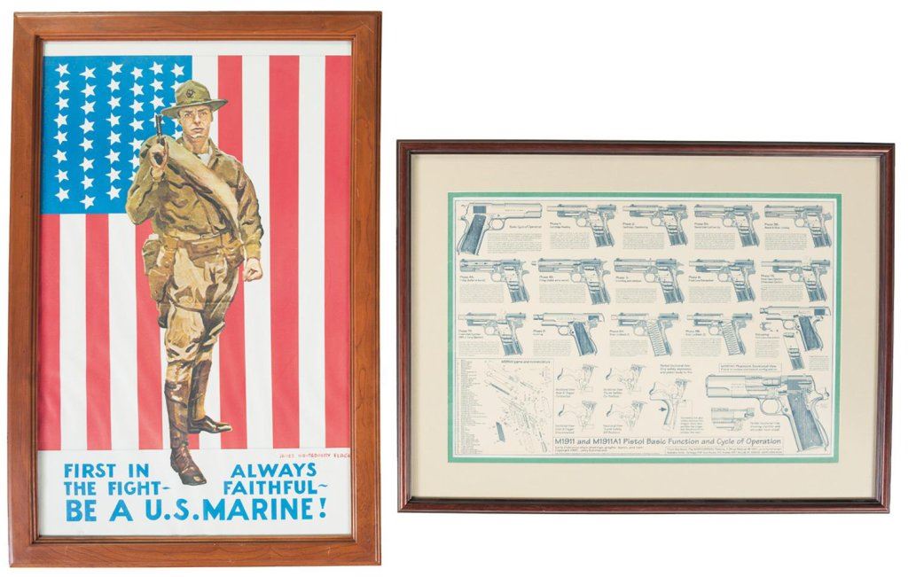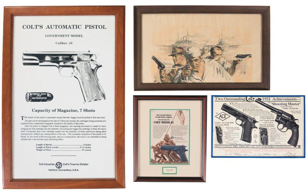 The lot contains: 1) Large "First in the Fight. Always Faithful- Be a U.S. Marine" framed poster. 2) Large "M1911 and M1911A1 Pistol Basic Function and Cycle of Operation" framed poster. 3) Large "COLT'S AUTOMATIC PISTOL GOVERNMENT MODEL" framed poster. 4) Framed WWII Navy themed poster. The three leading men all have Model 1911 style pistols. 5) Framed "Introducing the COLT M1991A1" ad from "The American Rifleman Dec. 1991". 6) Framed Colt Ace and Shooting Master ad. 7) Framed Colt .22 Official Police and Officer Model revolvers ad. 8) Framed "AN ALL-AMERICAN SECOND ELDER" print from "The Ladies Home Journal October 1919". 9) Empty frame. 10) Box with sixteen pieces of firearms literature (mostly books). Condition: very good to excellent overall.