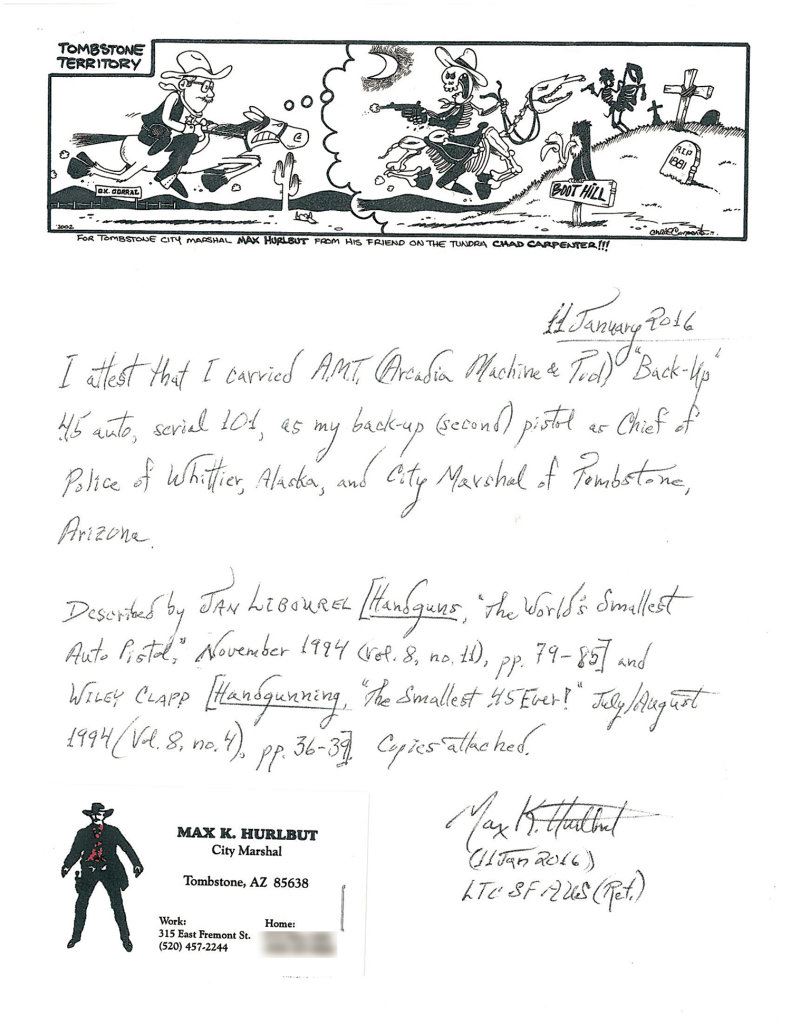 Includes 6 extra magazines, a signed statement from Max K. Hurlbut that he carried this pistol as his secondary while serving as the Chief of Police in Whittier, Alaska, and City Marshal of Tombstone, Arizona, and other assorted documents.