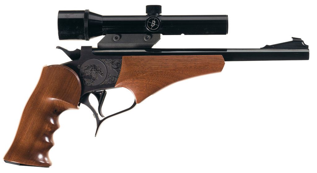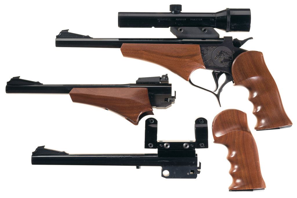 Fitted with a Bushnell Magnum Phantom 13x scope. Includes a 10" .22 Hornet barrel with a scope base and rings, 10" .22 LR barrel with walnut forend, and an extra walnut thumb rest grip.