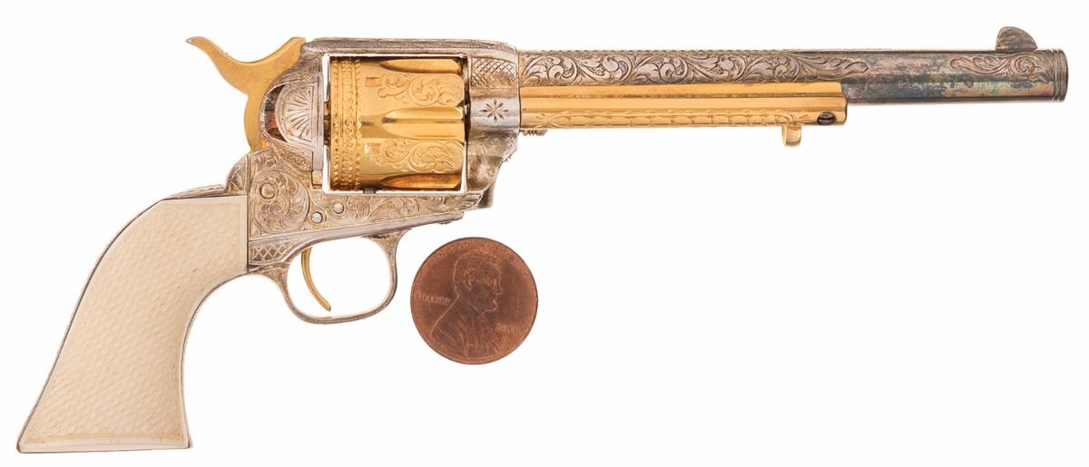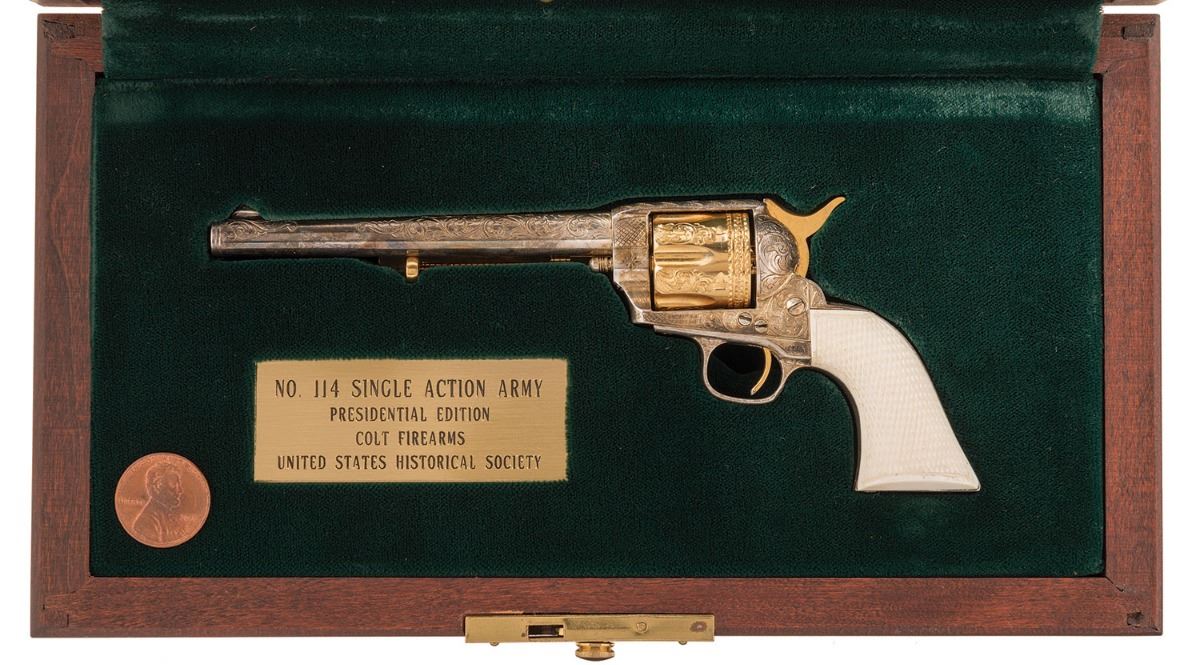 Engraved and Silver and Gold Plated United States Historical Society Presidential Edition Miniature Colt Single Action Army Cavalry Model Revolver with Display Case