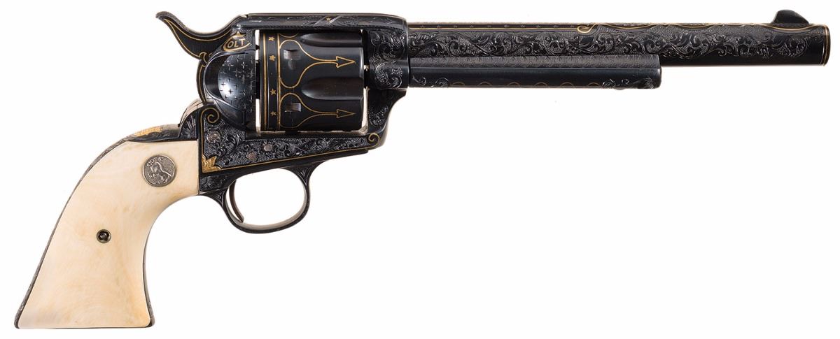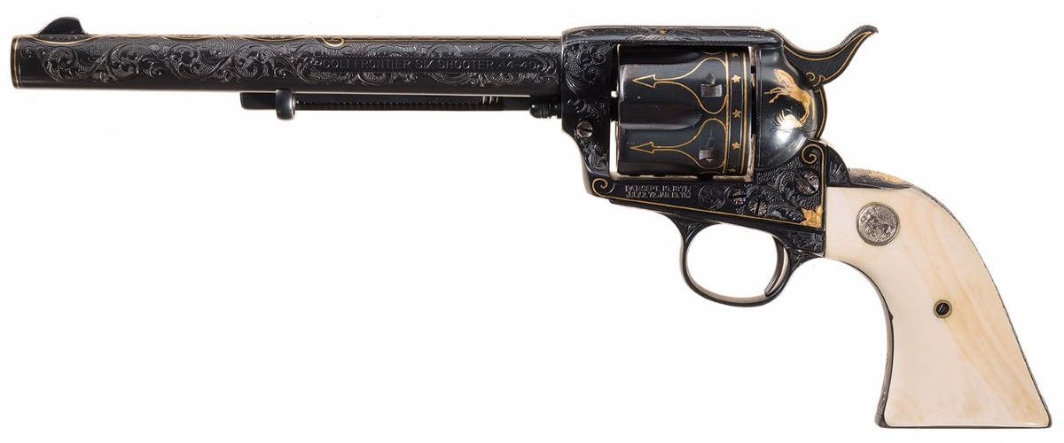 This revolver was manufactured in 1900 and subsequently engraved and gold inlaid by the late Virgil Graham whose work has been featured in many publications and some of the most iconic late-20th century westerns including "Silverado" and "The Quick and the Dead." Among the classic floral scrollwork patterns are designs based on important aspect's of Colt's heritage including the Colt Armory dome and the Rampant Colt. Graham's signature is on the butt.