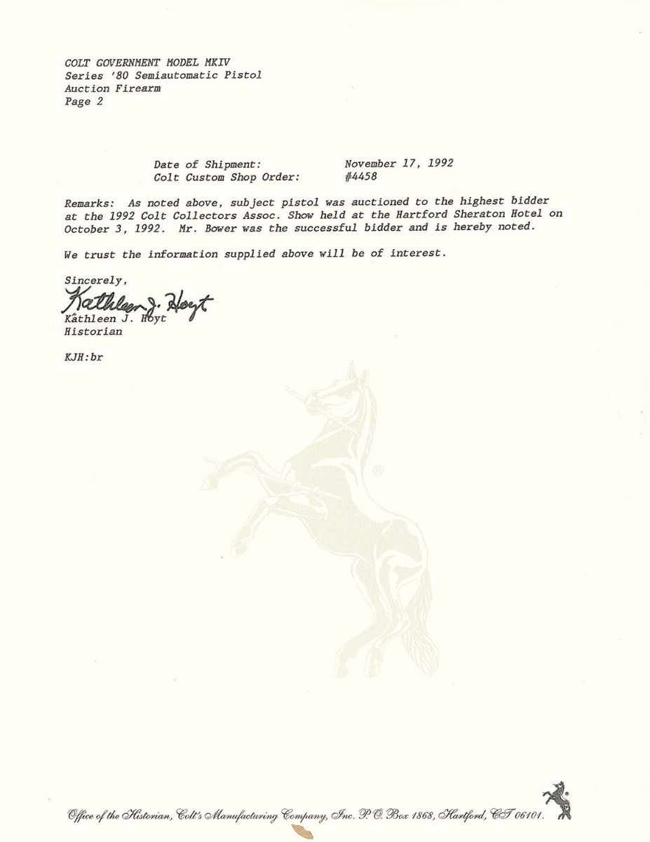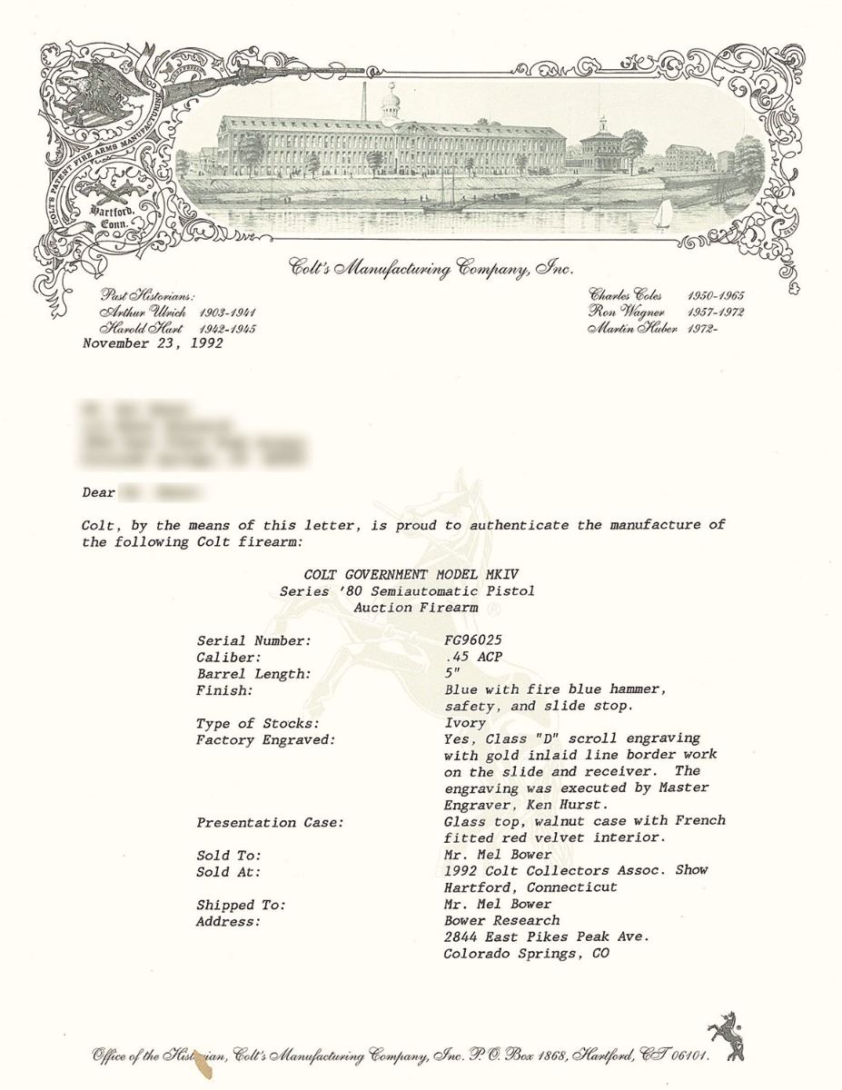 The included factory letter confirms the factory "D" class scroll engraving, gold inlays, and Master Engraver Ken Hurst. It further confirms the grips, barrel length, caliber, serial number, and year of sale as 1992 at the Colt Collector's Association Show in Hartford, CT. Includes a glass top display case with red velvet lining also confirmed in the factory letter. A Colt Custom Shop box numbered to the gun is also included.