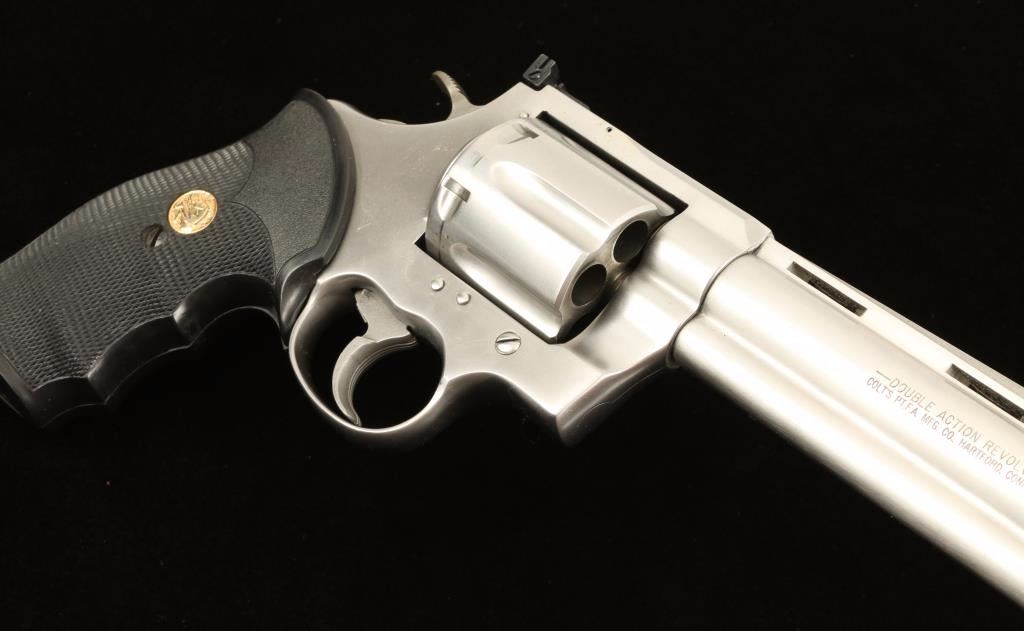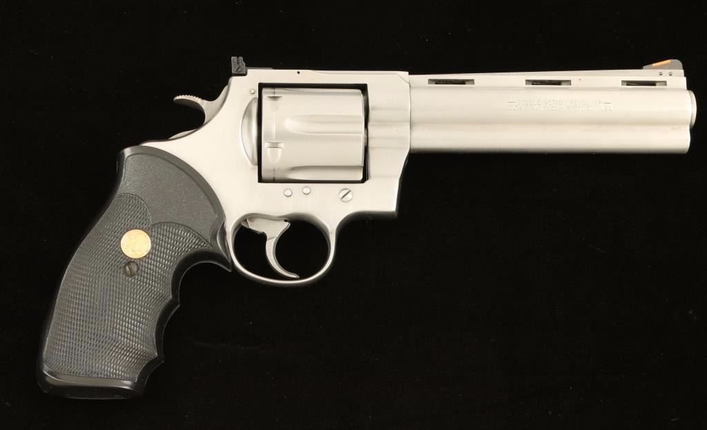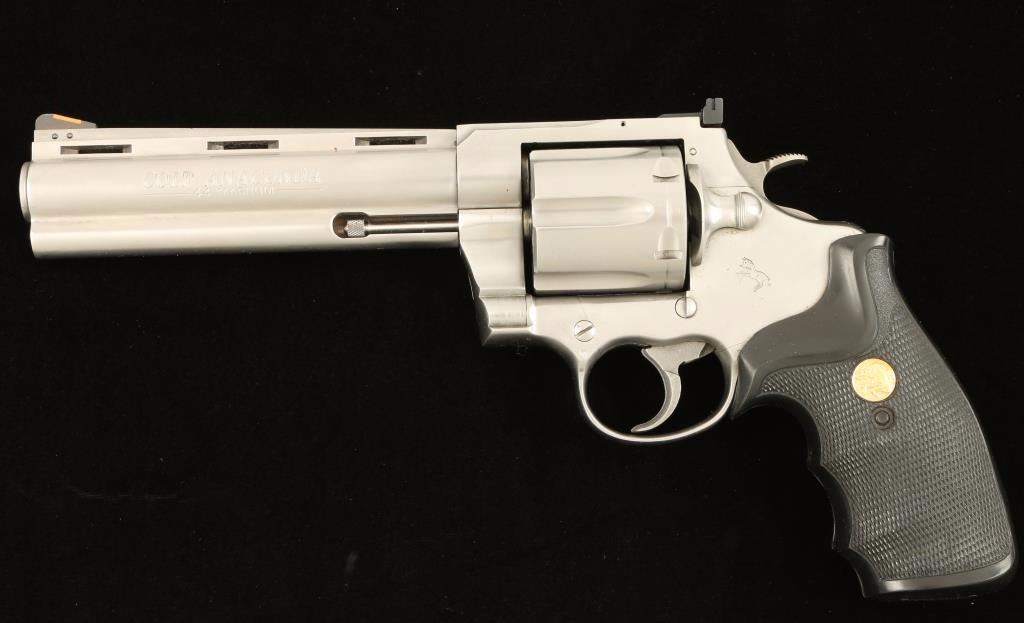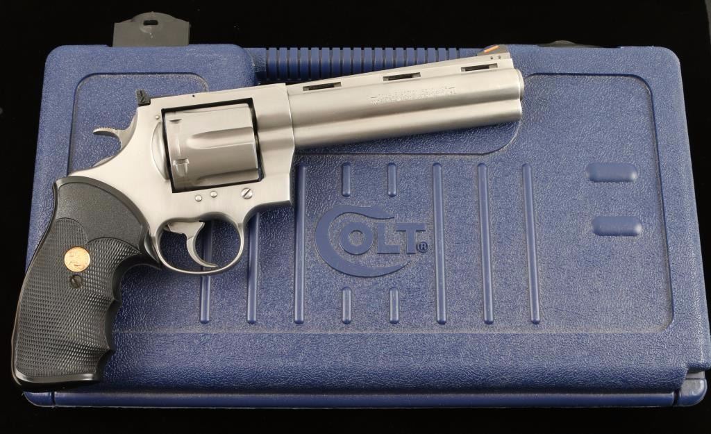 Premium stainless steel double action revolver chambered in .44 Magnum. Features a satin finish, 6" vent ribbed barrel, full underlug, pinned blade front sight, adjustable rear sight window, fluted six shot cylinder, partially serrated trigger, flat top frame, serrated hammer spur and Colt medallion black checkered rubber grips. Includes Coltg hard case. Pistol show light handling wear and a heavy drag line. Action is smooth, bore is pristine, and grips are fine. Condition is near excellent is case. ***Modern Firearm***