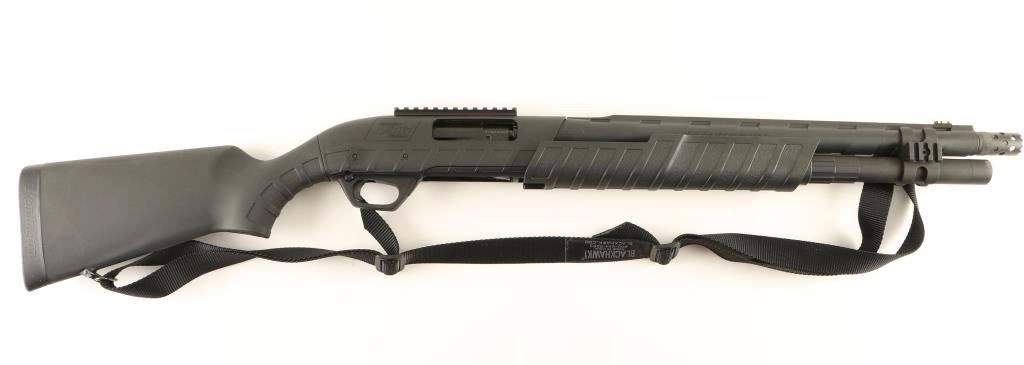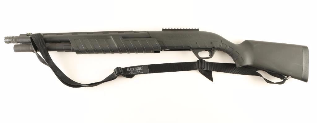 'Nitromag' Durable slide action repeating shotgun chambered for 2 3/4", 3" or 3.5" 12 gauge shells. Features a black synthetic armor coat, 18.5" barrel, tactical extender cylinder choke, full tube magazine, raised rib on barrel with HiVis front sight, scope rail on receiver, manual safety, serrated trigger, Blackhawk black nylon sling, SuperCell recoil pad, black synthetic slide handle and pistol grip shoulder stock. Shotgun shows slight handling wear with few scuffs on the synthetic stock. Action is smooth, bore is pristine and stocks are fine with minimal marks. Condition is near new in box. ***Modern Firearm***
