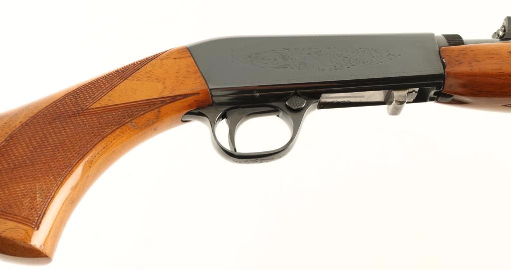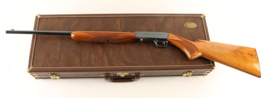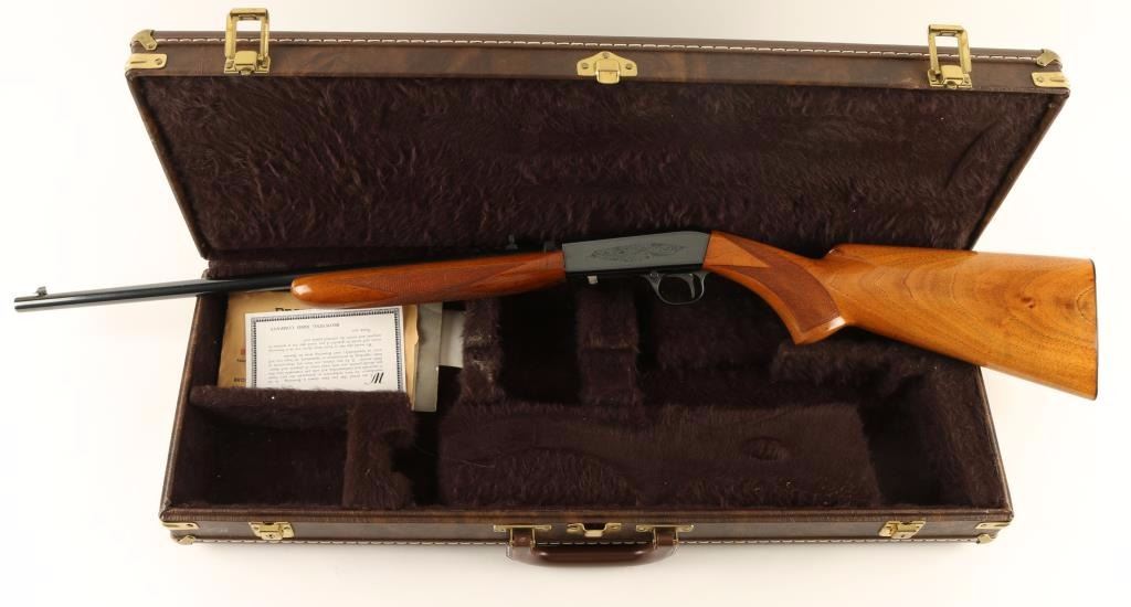 'Grade I' Expertly refinished Belgium made blowback operated semi automatic rifle chambered in .22 Long Rifle, circa 1964. Features a high polish blued finish, 19.25" take-down barrel, gold bead blade front sight, flip up adjustable rear sight, floral engraved receiver, push button safety, smooth trigger, 11 round tubular magazine, and high gloss checkered walnut forend & pistol grip shoulder stock with serrated metal buttplate. Includes a Browning fitted carrying case with keys and documents. Rifle shows a quality refinish with 97% finish retained with only slight storage wear and a small amount of dark rust around the front sight.