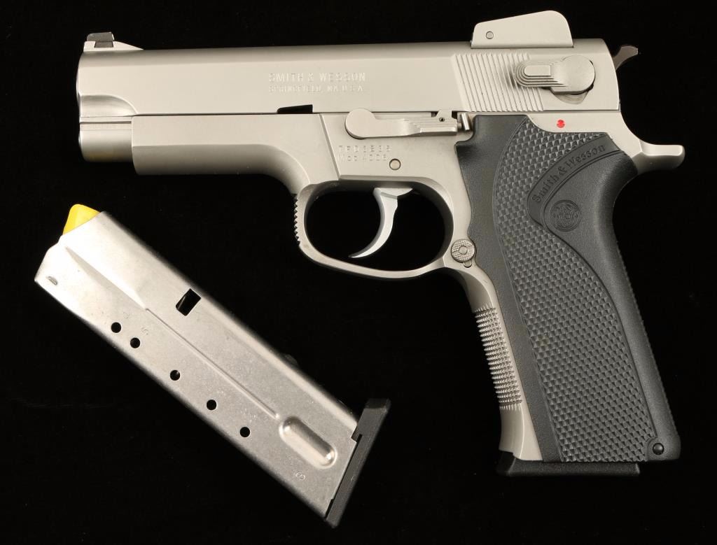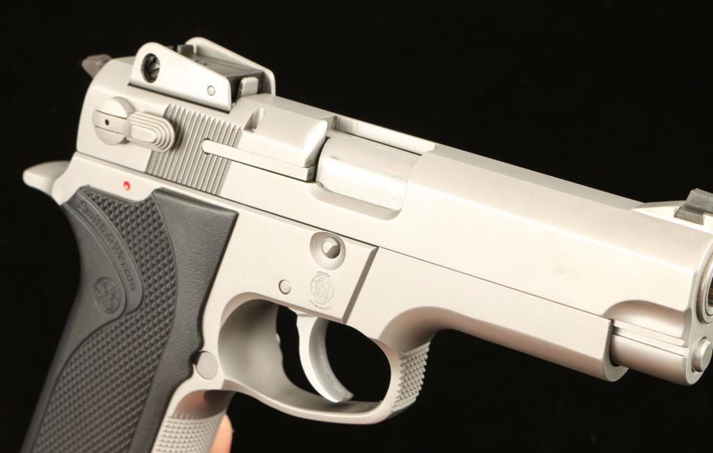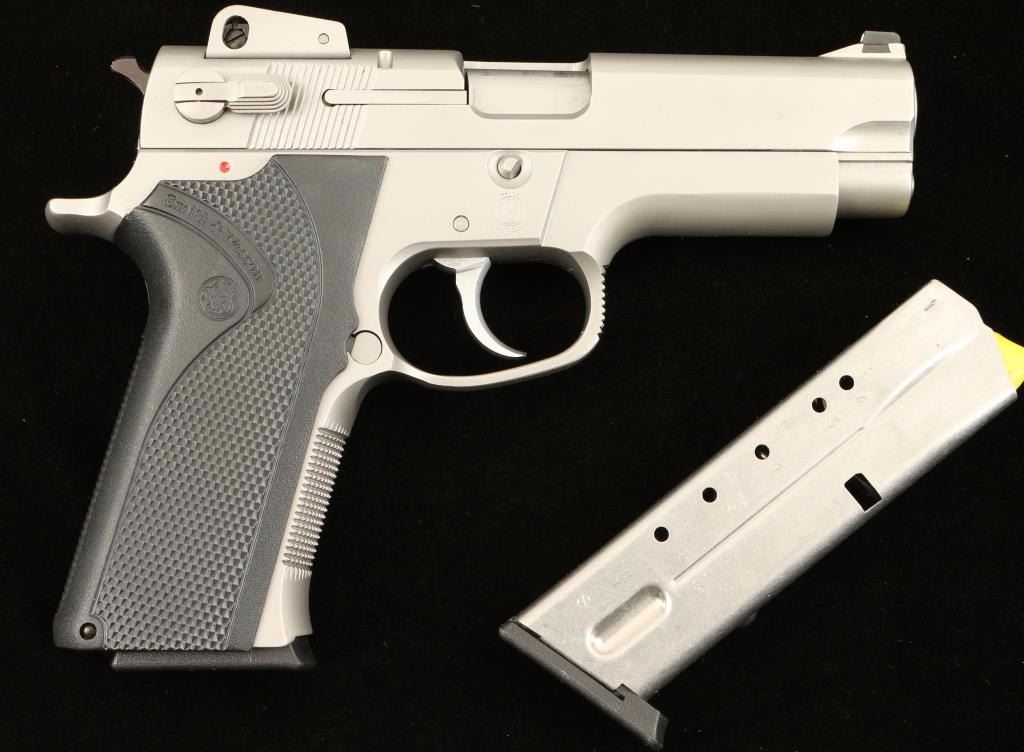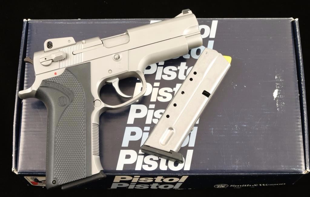 Stainless steel double action semi-automatic pistol chambered in .40 Smith & Wesson. Features a satin finish, 4" barrel, ramped & dovetailed front sight. shrouded adjustable front sight, ambidextrous decocker, smooth trigger, serrated hammer spur, push button magazine release, 11 round magazine, checkered front grip strap, and Smith & Wesson black checkered plastic wrap around grips. Includes original factory box with extra magazine, documents, and tools. Pistol shows only light wear on barrel and is otherwise pristine. Action is smooth, bore is excellent, and grips are fine. Condition is excellent in box. ***Modern Firearm***