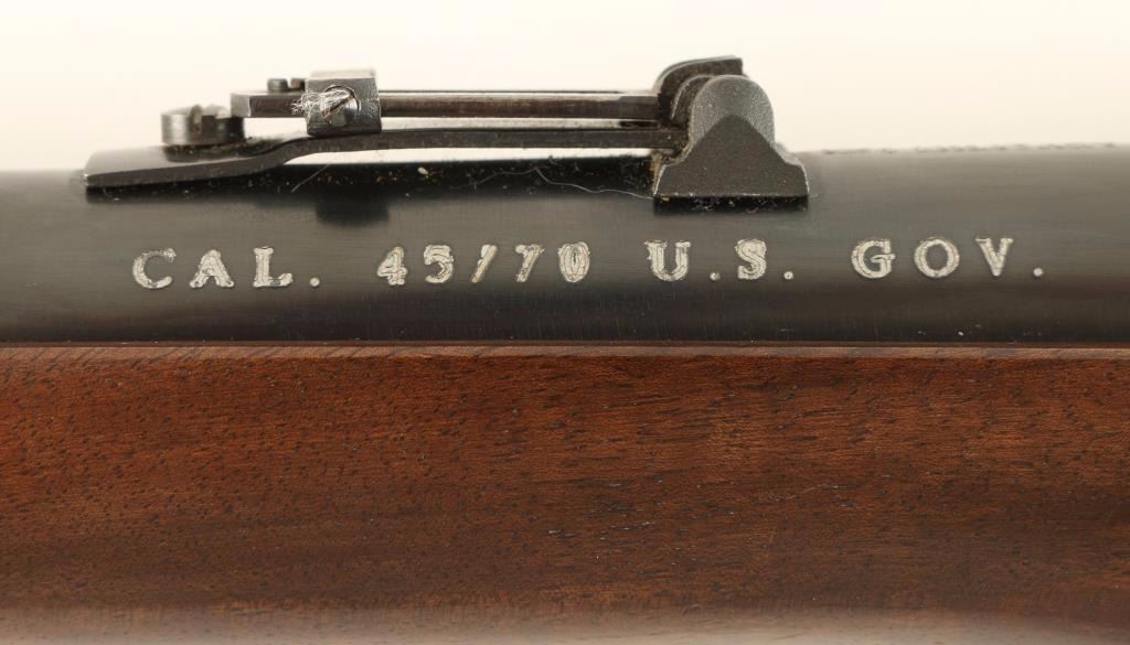 Modern Italian reproduction of the Sharps Model 1874 falling block single shot rifle, chambered in .45-70 Gov't. Features a blued 22" barrel, blade front sight, folding mid-range sight, case hardened receiver, saddle ring checkered hammer spur, smooth wood forend and straight grip shoulder stock with metal buttplate. Rifle shows light wear to the metal surfaces and several small dings to the wood shoulder stock. Action is sound and bore is excellent. Condition is very good+. ***Modern Firearm***