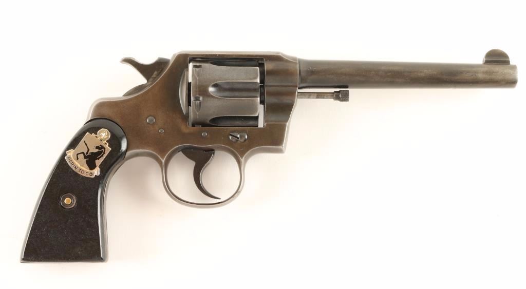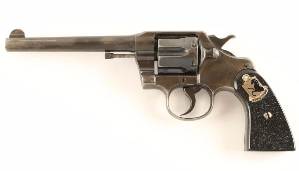 Large frame double action revolver chambered in .38 Special, circa 1910. Features a blued finish, 6" barrel, blade front sight, notched rear sight, fluted six-shot cylinder, smooth trigger, checkered hammer spur and custom two piece flat black plastic grips with "Rarin To Go" emblems. Revolver's blued finish is drifting to a brown patina with some bright bluing in protected areas. Action is smooth, bore is excellent, marking are good and grips are fine. Condition is good to very good as vintage. ***Modern Firearm*** ***C&R Firearm***