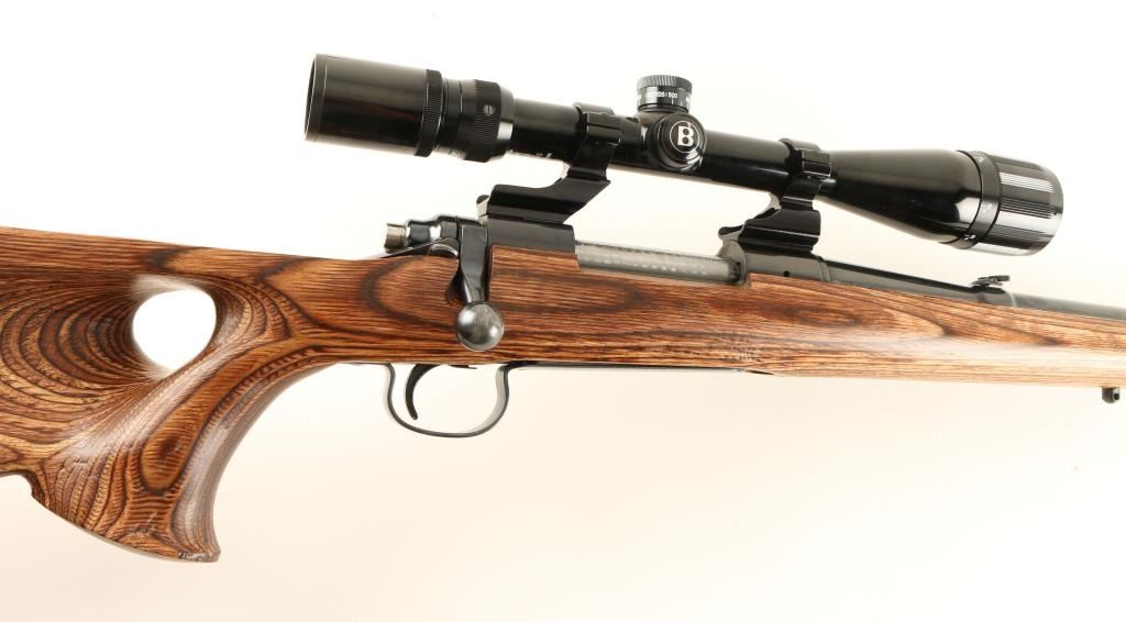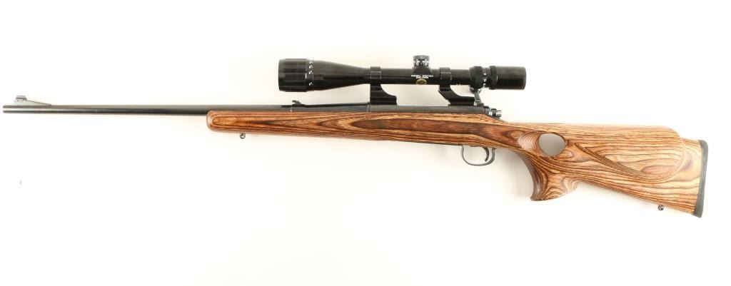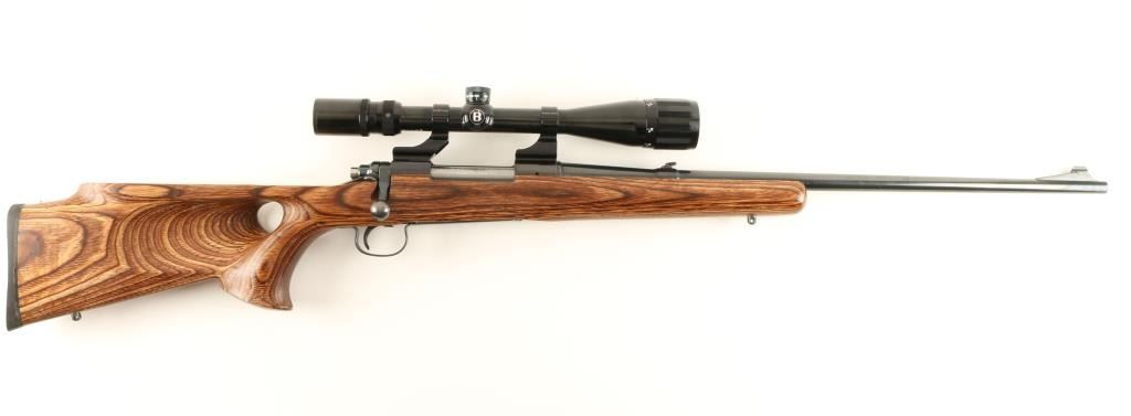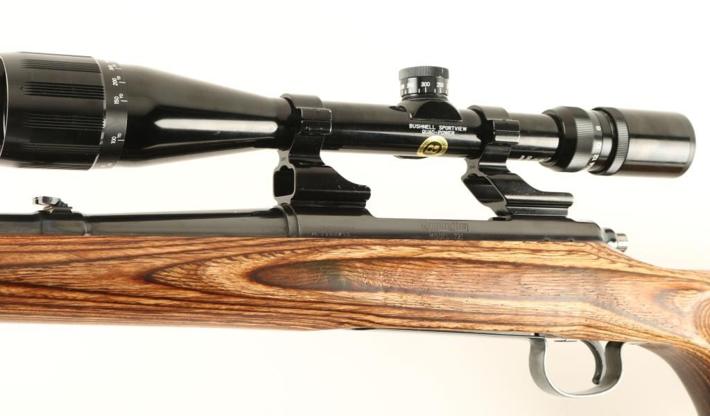 Bolt action sporting rifle chambered in .30-06 Springfield, circa 1948 - 1962. Features a blued finish, 24" tapered barrel, ramped blade front sight with white bead, adjustable folding leaf rear sight, Bushnell Sportview Quad-Power 5-20x scope one see-through rings, jeweled bolt, manual safety, serrated trigger, swivel studs, and brown laminated wood thumb-hole pistol grip shoulder stock with rubber recoil pad. Rifle shows 93% finish with light wear on barrel bearing light oxidation. There is also an AZ drivers license number lightly scratched in the receiver under the serial number. Action is smooth, bore is excellent and wood stock is fine. Condition is very good. ***Modern Firearm***