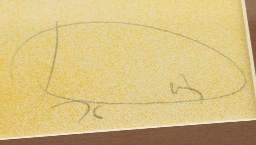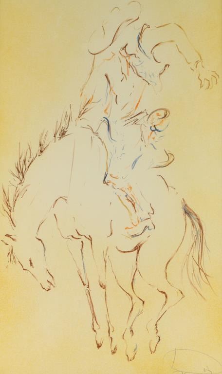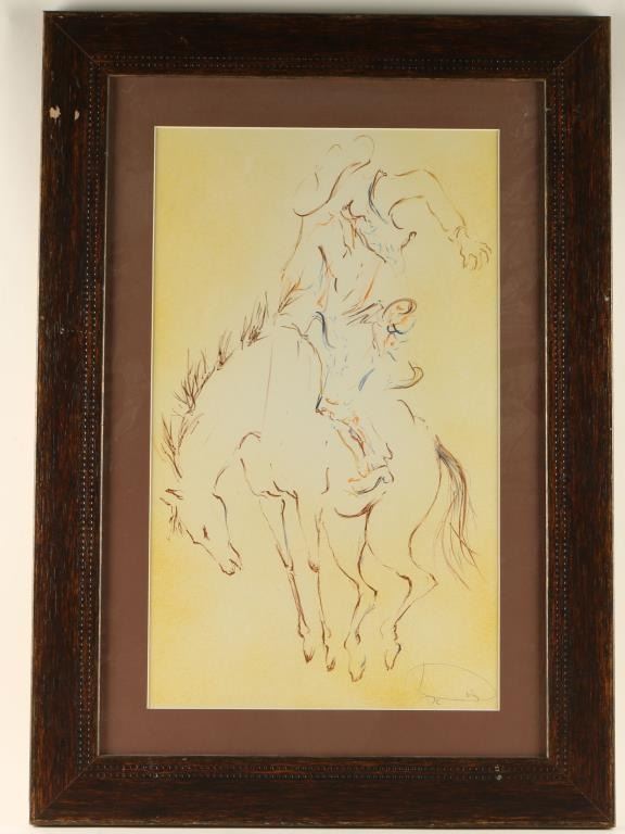 Linear sketch of cowboy on bucking bronc by Laszlo Dus. Signed lower right corner. Image measures 13 1/2" x 22 1/2". Single mat with wood frame.