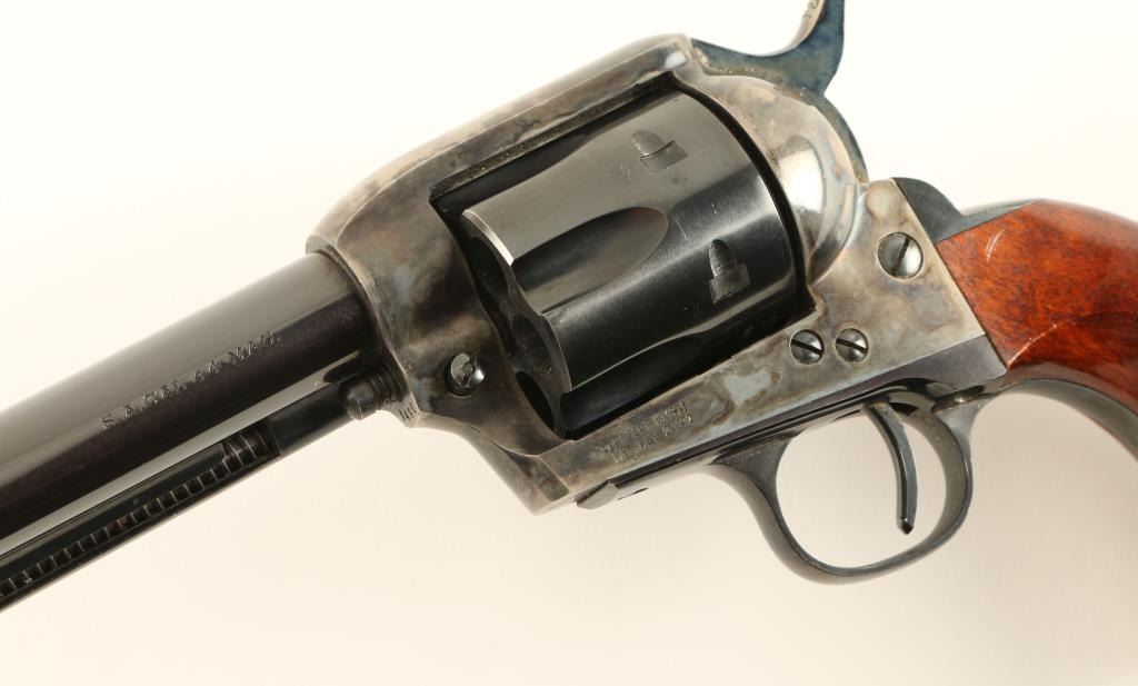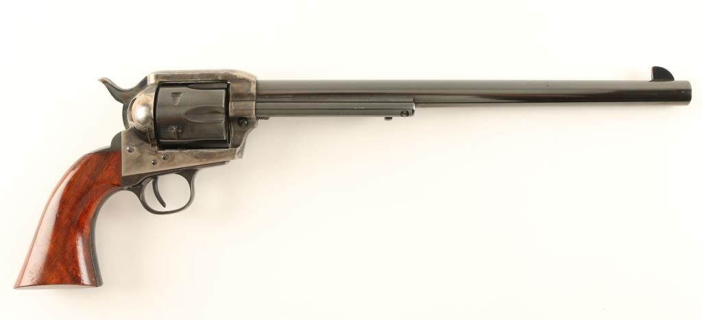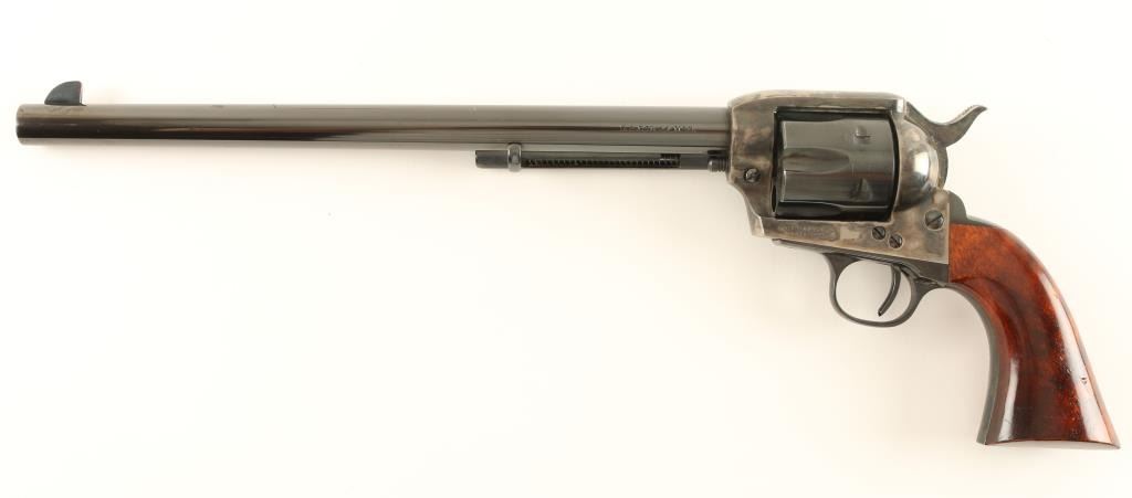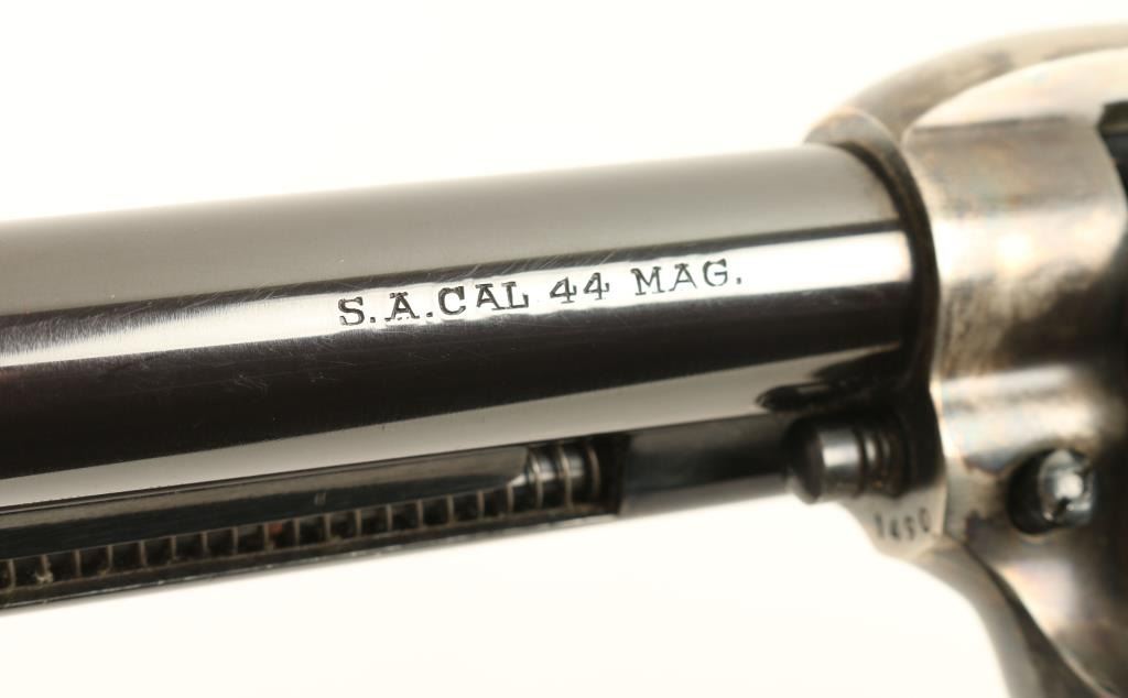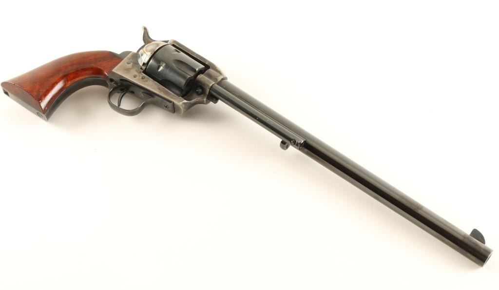 Italian copy of the Colt 1873 Buntline single action revolver chambered in .44 Magnum. Features a blued and case hardened finish, 12" barrel, ejector rod, blade front sight, v-notched rear sight, fluted six shot cylinder, checkered hammer spur and two piece hardwood grips. Revolver exhibits 95% of it's original blue finish with drifting case colors on frame. The hammer shows vivid colors & the top of the hammer does not meet the top of the frame, may be a replacement. Action is smooth, bore is pristine and grips are fine. Condition is very good+. ***Modern Firearm***