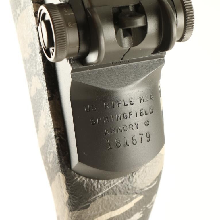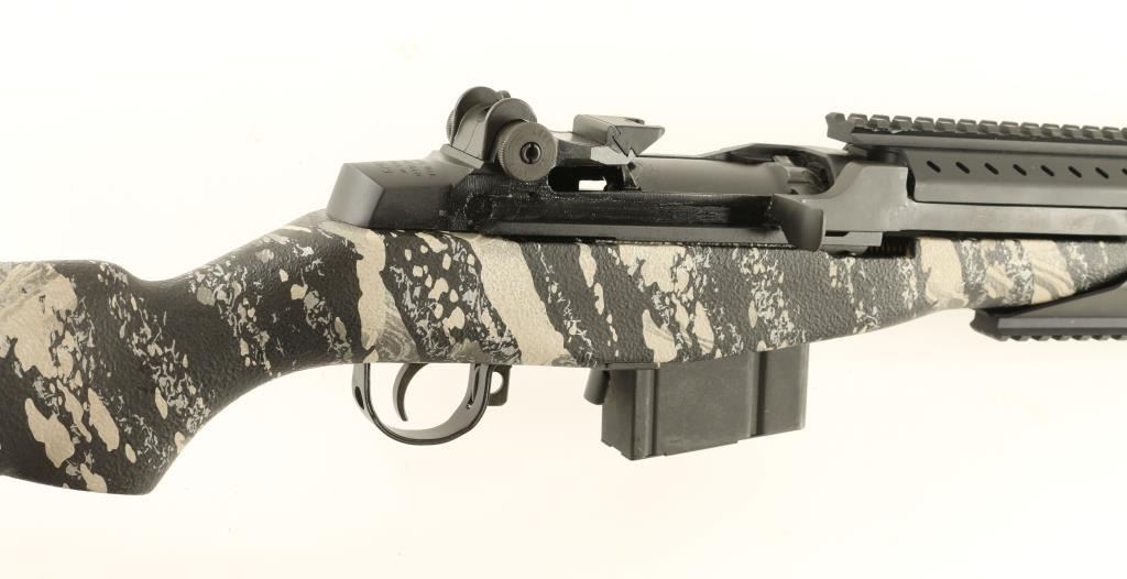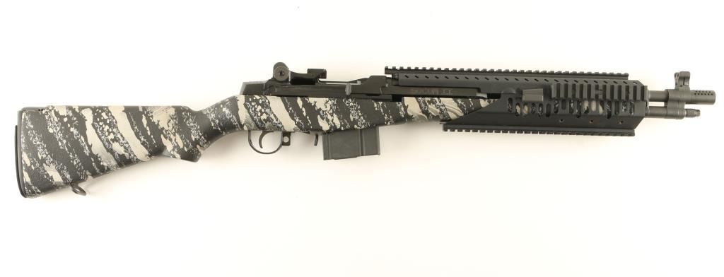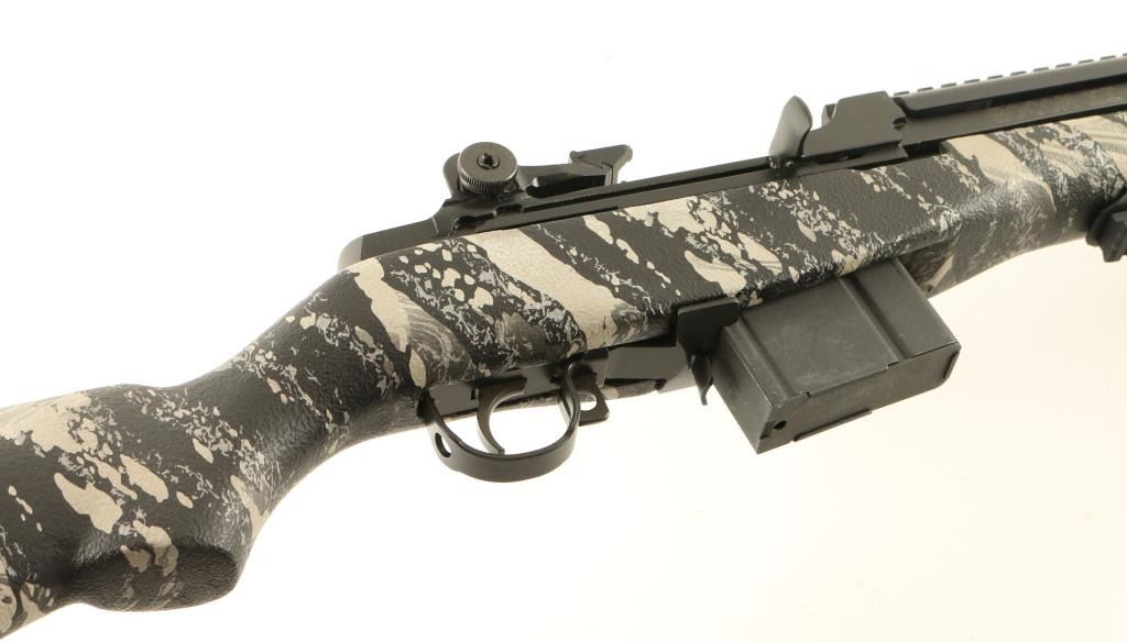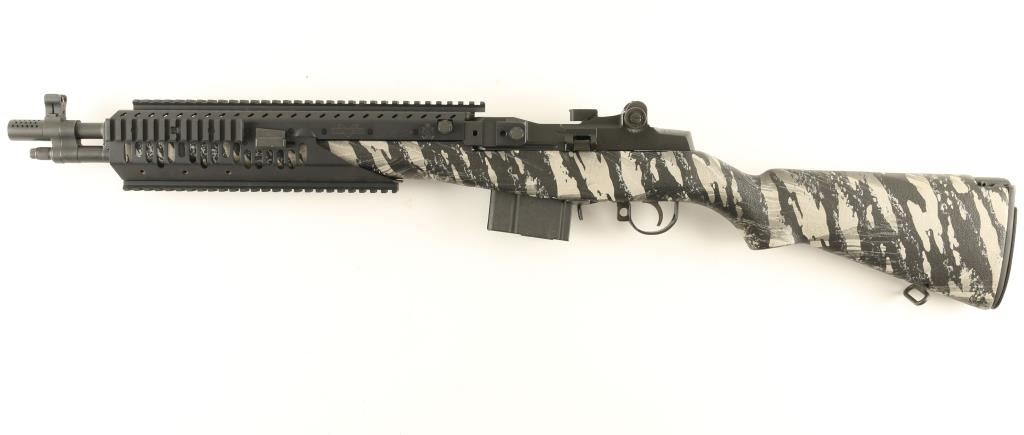 Semi automatic version of the M14 military rifle chambered in 7.62mm Nato. Features a blued finish, 16.25" barrel with muzzle break, Trijicon winged front sight, adjustable rear aperture sight, Vltor quad rail system, manual safety, 10 round magazine, two stage trigger and urban camo pistol grip stock with trapdoor buttplate. Includes original factory box with documents. Rifle retains 99% finish with only light handling marks observed. Action is smooth, bore is pristine, and stock is fine. Possibly unfired. Condition is like new in box. ***Modern Firearm***