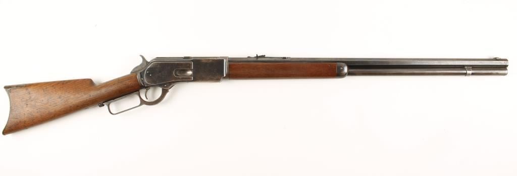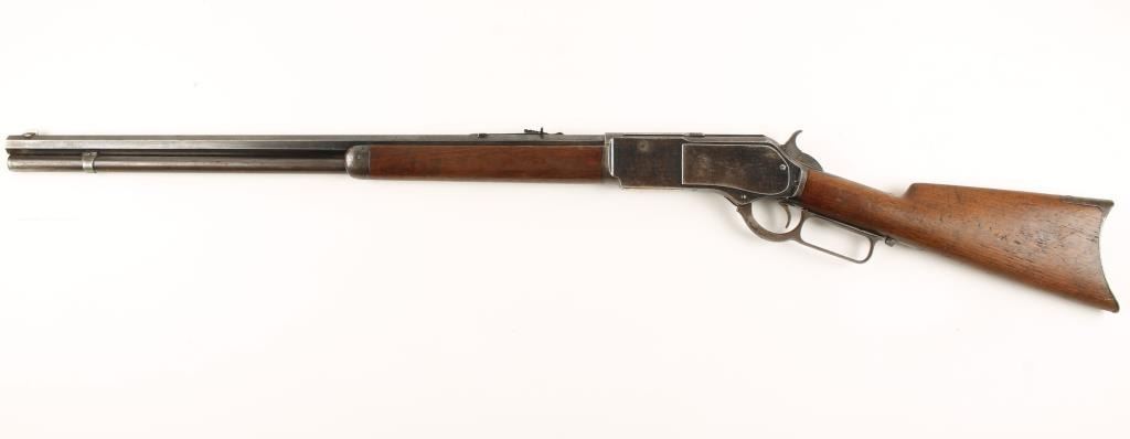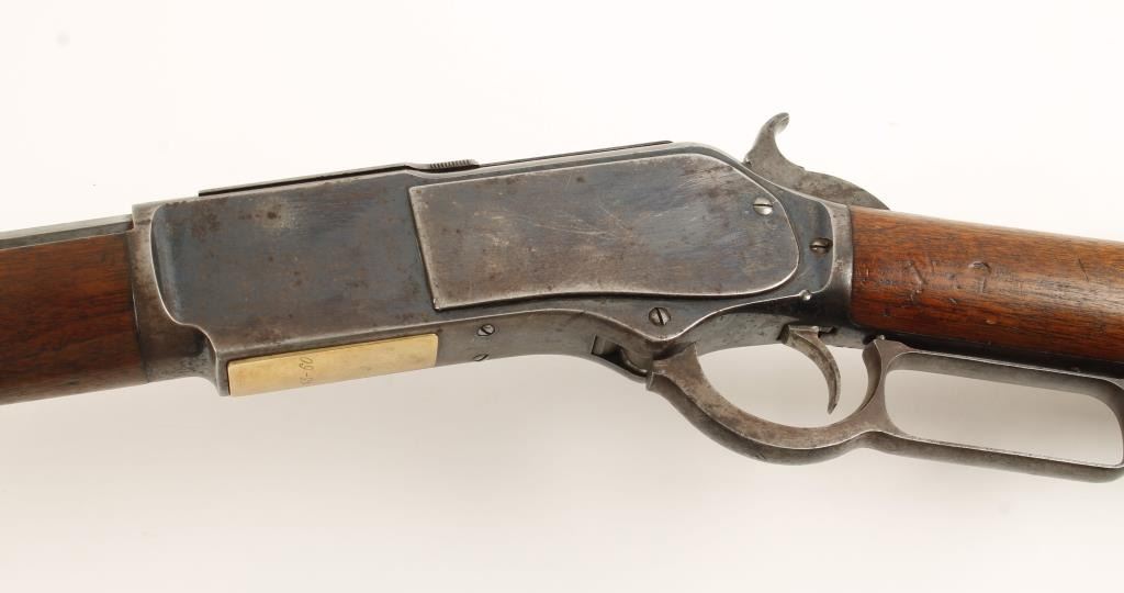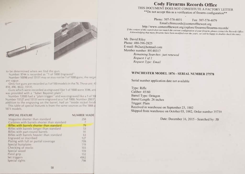 'Third Model' Rare 26" barreled lever action repeating rifle chambered in .45-60 Winchester Center Fire, circa 1882. 1 or only 79 1876 rifles manufactured with a shorter than standard barrel. Includes a letter from the Cody Firearms Museum listing the configuration and noting the 26" barrel. Features a fully blued finish, 26" octagonal barrel, full tube magazine, German silver blade front sight, adjustable rear sight, serrated dust cover, smooth trigger, cleaning rod, checkered hammer spur, metal forend cap, plain walnut forearm and straight grip shoulder stock with crescent buttplate. Also includes reference material as to the rarity of this barrel length. Finish retains 70% original bright bluing mixed with bare metal and browning patina. Marking are crisp. Wood stocks are near fine with minimal dings and very good fitting. Action is mechanically sound and bore retains a nice level of brightness. Condition is excellent. ***Antique Firearm***