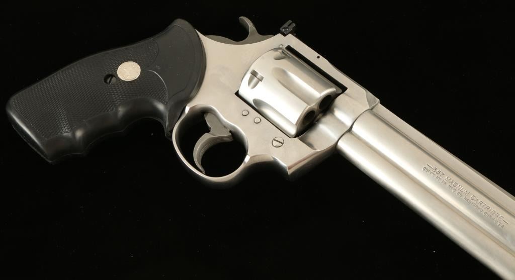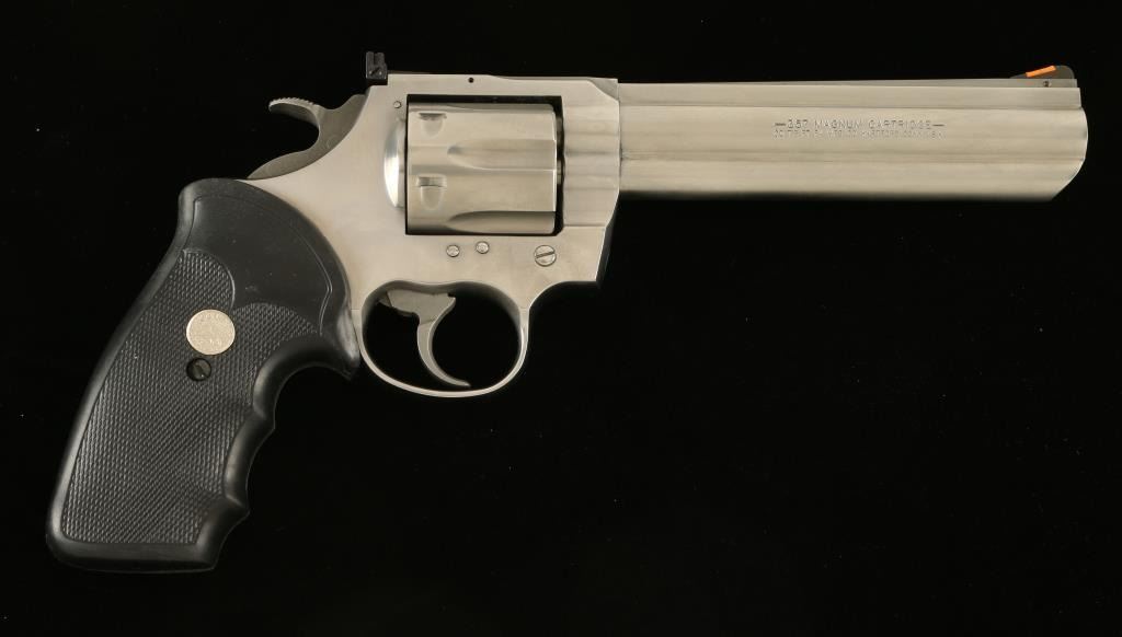 Stainless steel double action revolver chambered in .357 Magnum. Features a satin finish, 6" heavy ribbed barrel with recessed crown, full underlug, ramped front sight with orange insert, adjustable click rear window sight, fluted six shot cylinder, flat top frame, partially serrated trigger, serrated hammer spur, and Colt medallion black checkered rubber grips. Includes original factory hard case with sleeve, and documents. Revolver shows a single scratch near muzzle on the left side of the barrel and is otherwise excellent. Action is smooth, bore is pristine, and grips are fine. Condition is excellent in box. ***Modern Firearm***