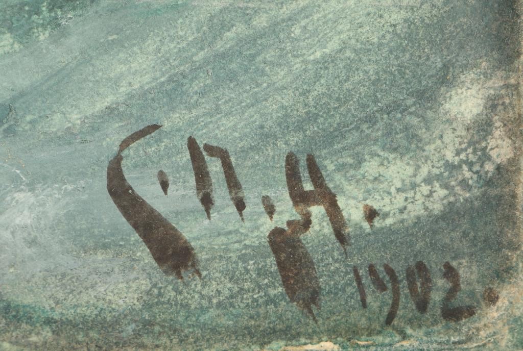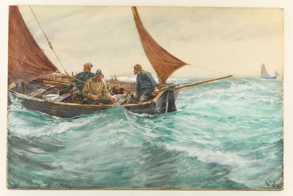 by noted artist Charles Napier Hemy, entitled Boat Study. Image Size is 26 1/2x 17 1/2. Signed lower left hand corner. Biography infomation: Born in Newcastle-on-Tyne, England, Charles Napier Hemy emigrated with his family to Australia in 1852. He returned to England three years later, signing aboard a merchant ship before making a decision to join a monastery. He spent three years first at the Dominican House in Newcastle and then in a monastery in Lyons, France. During that time he began to paint and decided to pursue art as a career. He studied at the Newcastle School of Art with history painter William Bell Scott, a friend of Dante Gabriel Rossetti. Inspired by John Ruskin and the Pre-Raphaelite painters, Hemy joined William Morris' Queen Square Stained Glass Workshop. There he rendered the designs of artists like Edward Burne-Jones, Ford Maddox Ford, and Phillip Webb into working drawings for the glass painters and glaziers. Both Morris and Burne-Jones became close friends. In 1862 Hemy saw the works of Belgian academic painter Baron Hendrik Leys at London's International Exhibition and decided to travel to Antwerp to study in Leys' atelier. Hemy exhibited at England's Royal Academy in 1869 and was elected to full membership in 1910. From 1870 to 1881 he lived in London. He later moved to Falmouth, where he fitted out a boat as a painting studio in order to follow fishing boats along the coast as he sketched them. A landscape as well as marine painter, Hemy's depiction of the open seas are particularly strong and vibrant, conveying a great sense of movement. Among the museums containing his works are the Walker Art Gallery in Liverpool; the Tate Gallery, London; Laing Art Gallery, Newcastle; National Gallery of New South Wales, Sydney. Hemy's younger brothers Thomas Hemy (1852-1937) and Bernard Benedict Hemy (1855-1913) were also marine painters.Charles Napier Hemy was born in Newcastle in 1841. When he was ten his family moved to Australia and for a time the young Charles worked as a gold miner. He returned to England in the late 1850's with the intention of entering the priesthood but shortly before taking his final vows, he changed his mind and decided to become a professional painter. He returned to Newcastle and studied at the Newcastle Art School. Hemy exhibited over eighty times at the Royal Academy from 1865 until his death in 1917. In the 1880's he moved to Falmouth and from this point devoted his career to marine painting. A keen sailor himself, his deep understanding and love of the sea is evident in his works and a favorite device was to place the horizon quite high on the canvas in order to depict the full majesty of the sea.